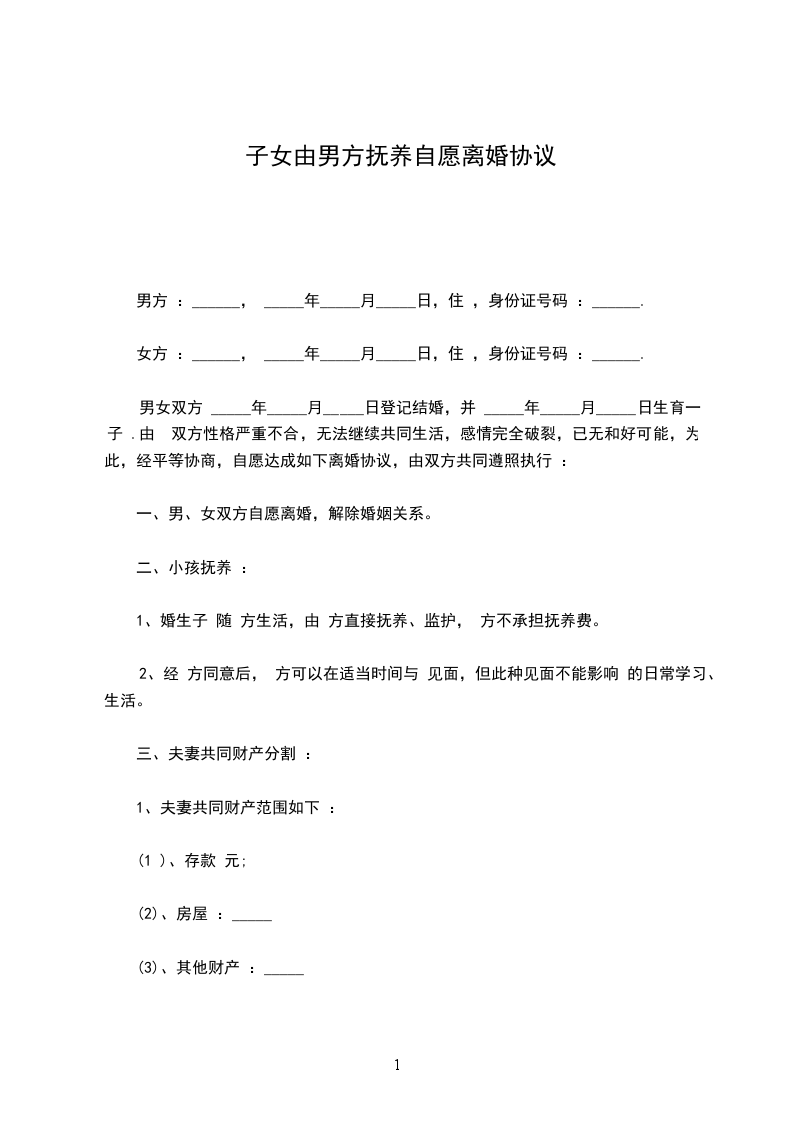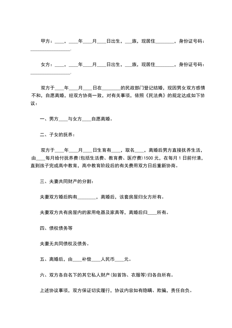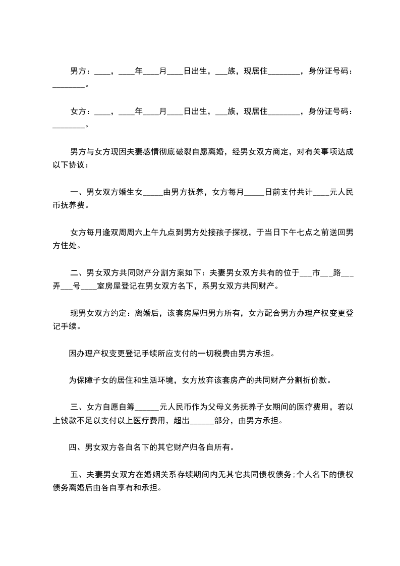 男女双方_________年_________月_________日结婚,_________年_________月生一女(子)_________,现就离婚事议达成如下协议,供双方遵照执行: