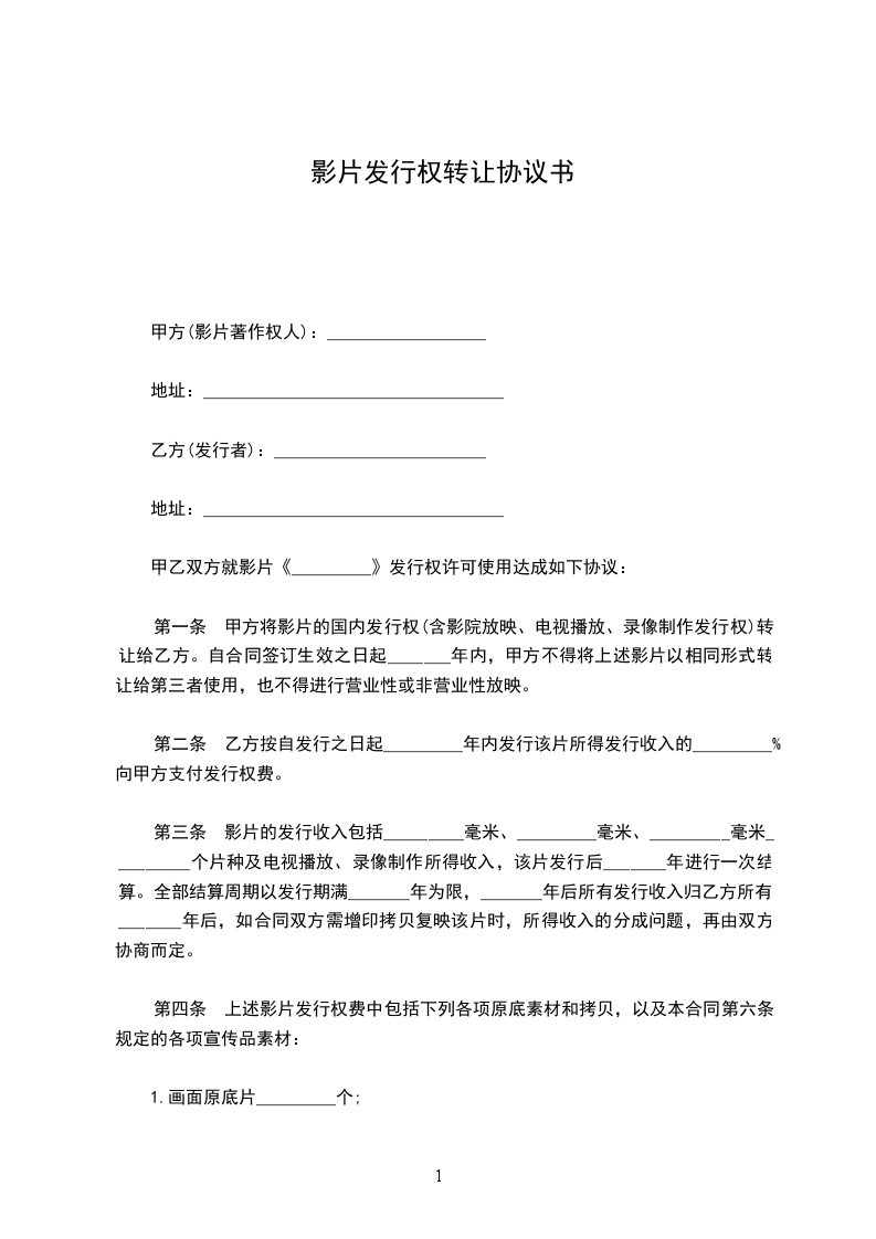 第一条 甲方将影片的国内发行权(含影院放映、电视播放、录像制作发行权)转让给乙方。自合同签订生效之日起_______年内,甲方不得将上述影片以相同形式转让给第三者使用,也不得进行营业性或非营业性放映。
