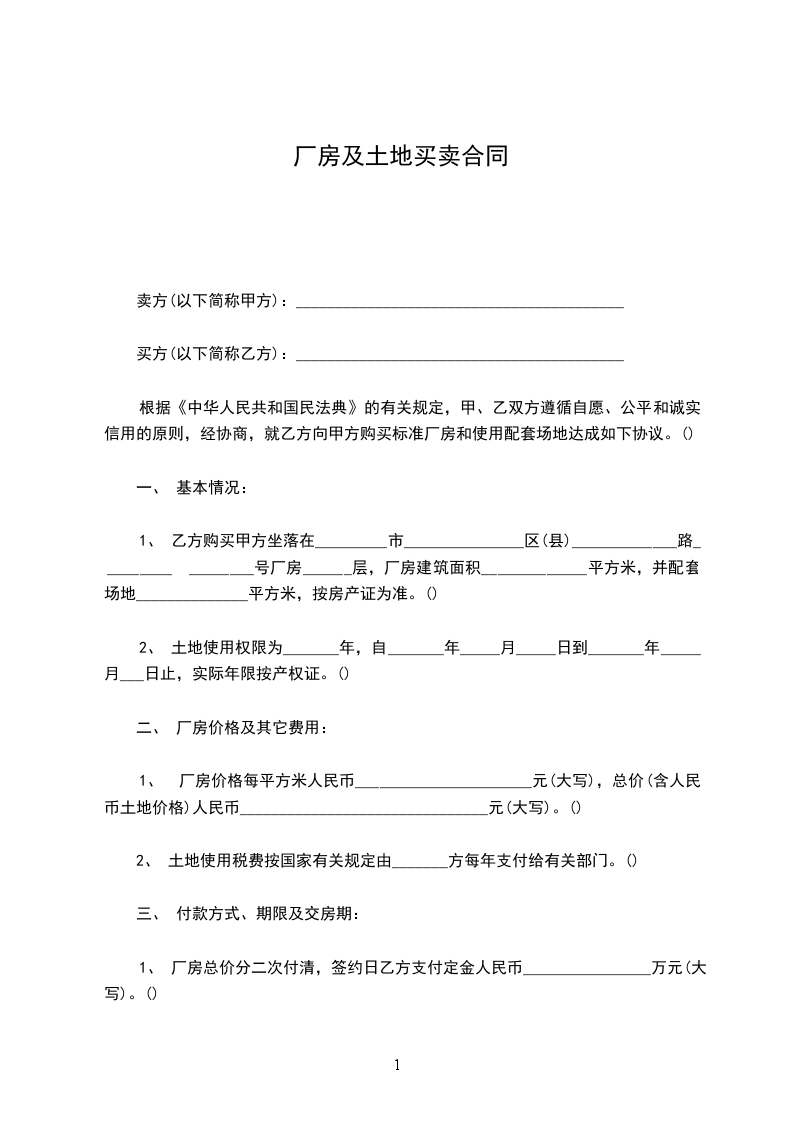1、乙方购买甲方坐落在_________市_______________区(县)_____________路_________,________号厂房______层,厂房建筑面积_____________平方米,并配套场地______________平方米,按房产证为准。