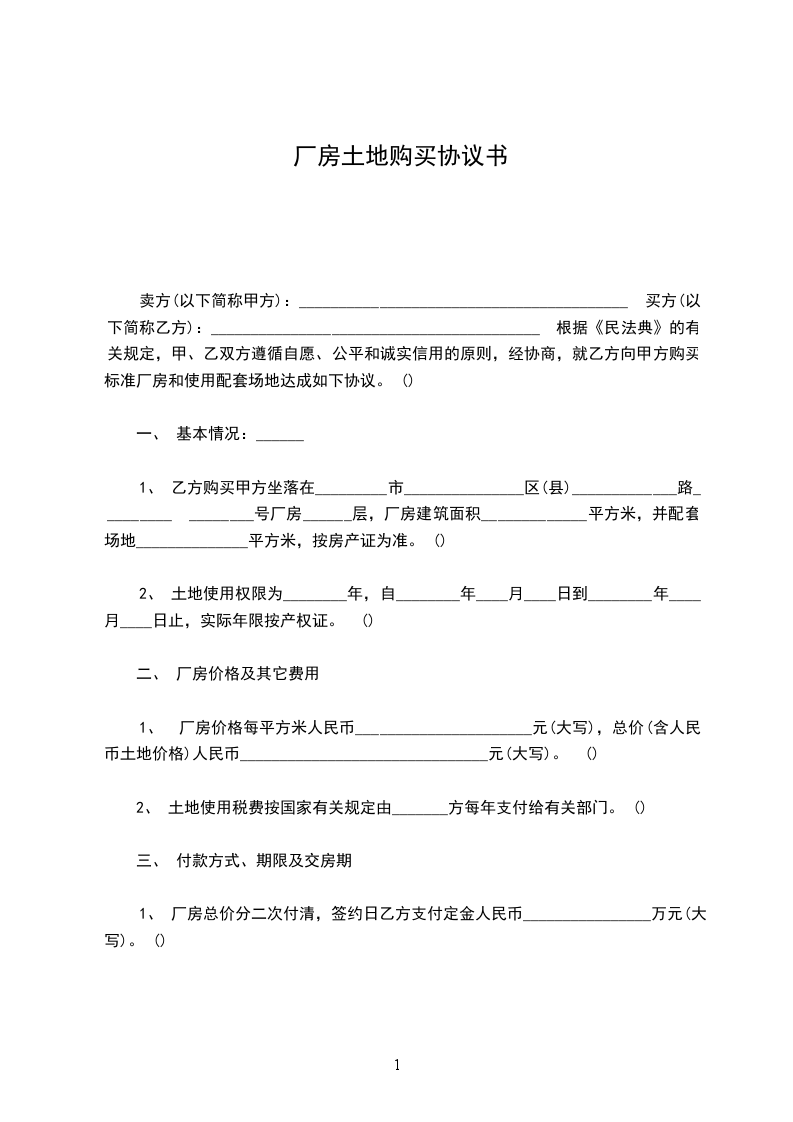 根据《民法典》的有关规定,甲、乙双方遵循自愿、公平和诚实信用的原则,经协商,就乙方向甲方购买标准厂房和使用配套场地达成如下协议。