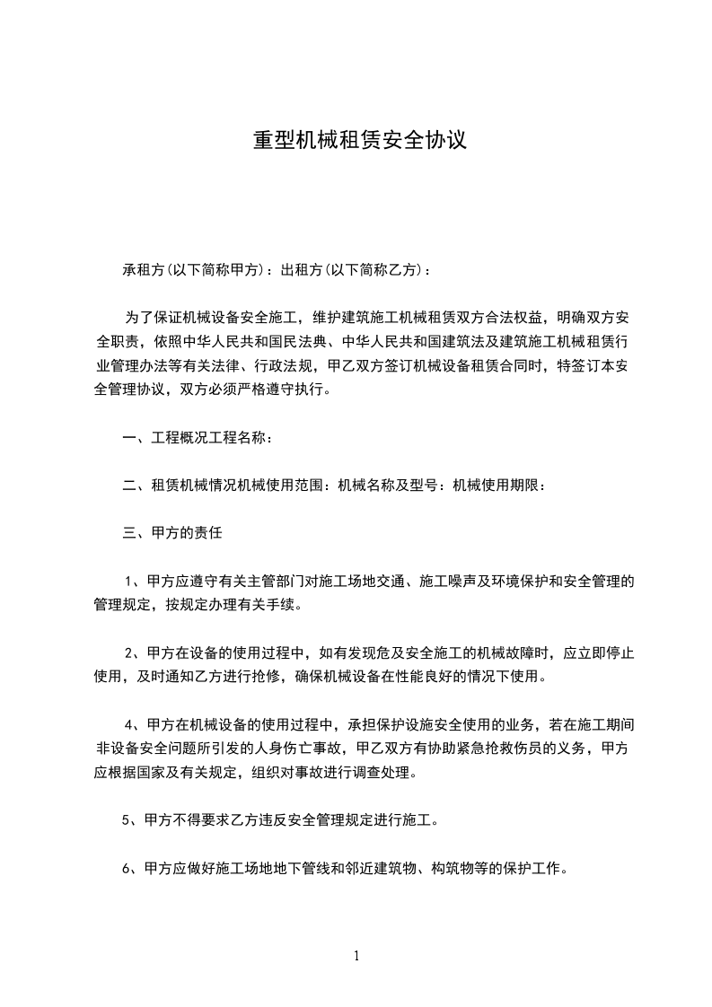 为了保证机械设备安全施工,维护建筑施工机械租赁双方合法权益,明确双方安全职责,依照中华人民共和国民法典、中华人民共和国建筑法及建筑施工机械租赁行业管理办法等有关法律、行政法规,甲乙双方签订机械设备租赁合同时,特签订本安全管理协议,双方必须严格遵守执行。