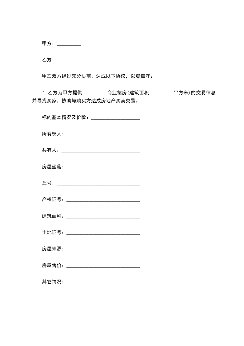 1.乙方为甲方提供__________商业裙房(建筑面积__________平方米)的交易信息并寻找买家,协助与购买方达成房地产买卖交易。