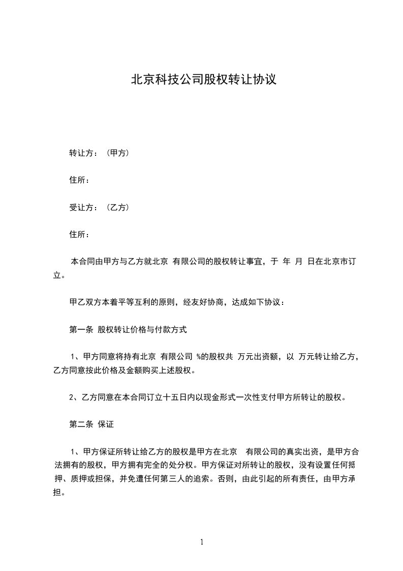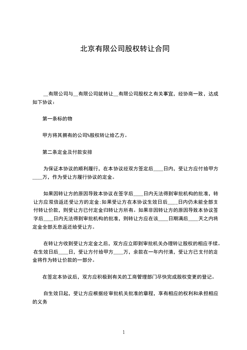1、甲方同意将持有_______有限公司_______%的股权共_______万元出资额,以_______万元转让给乙方,乙方同意按此价格及金额购买上述股权。