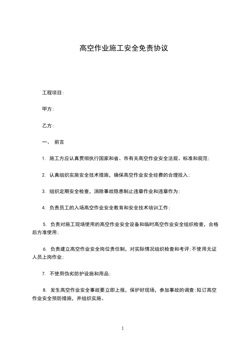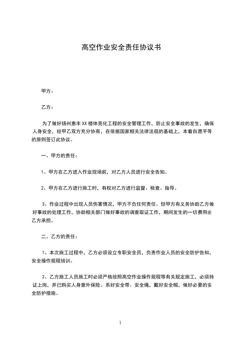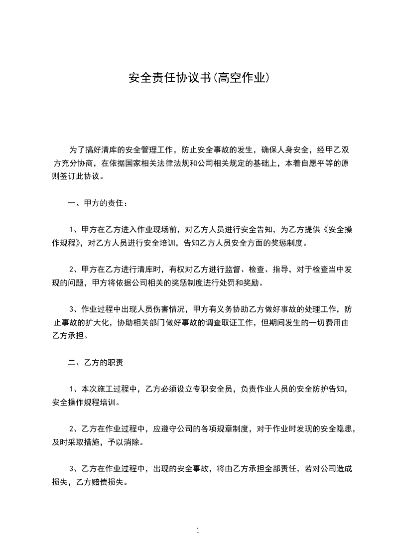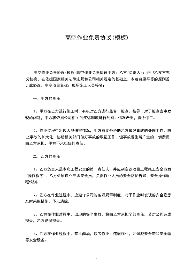 1. 若因甲方违反本协议约定的安全责任与义务,导致自身在高空作业过程中发生安全事故,乙方(如有)不承担任何法律责任及经济赔偿责任。