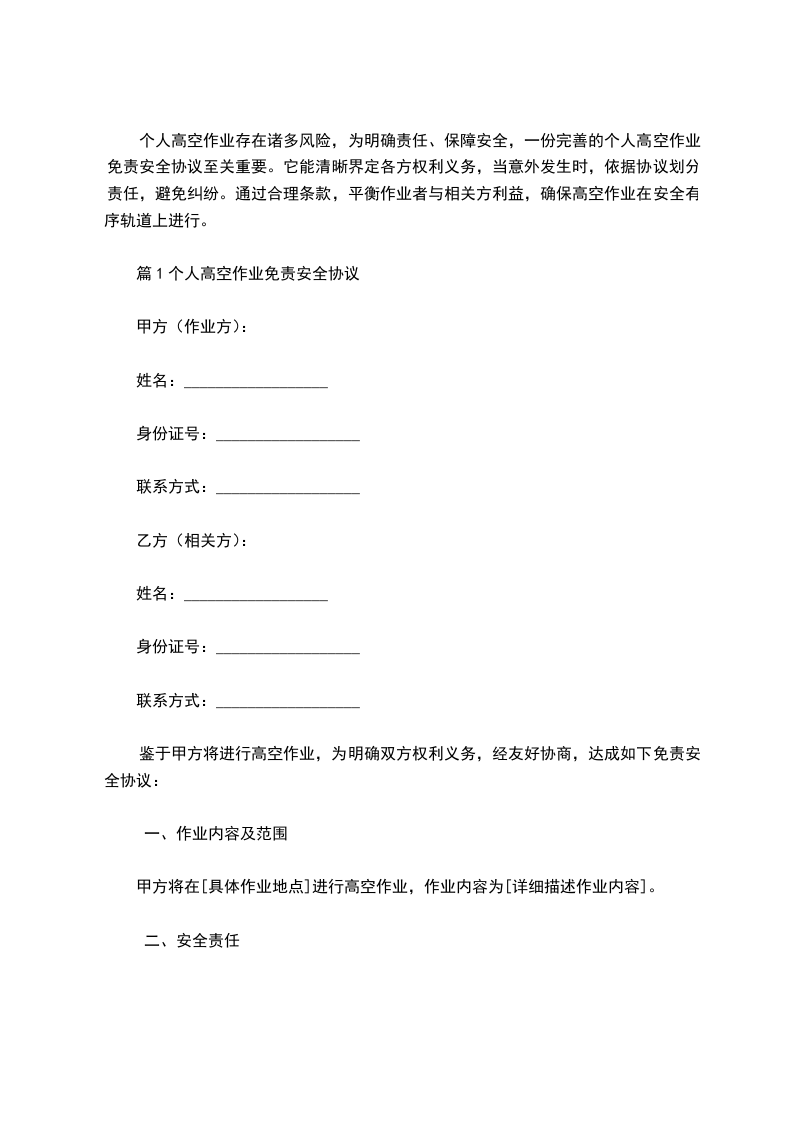 篇1个人高空作业免责安全协议