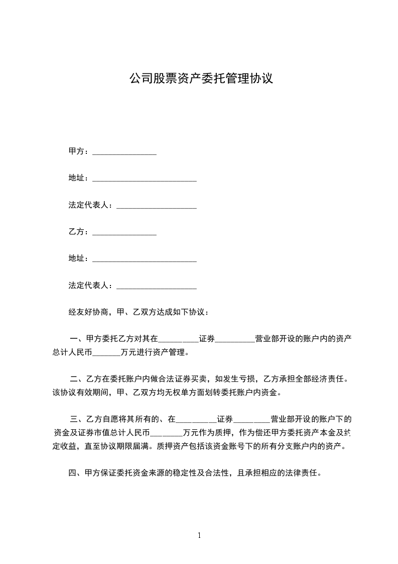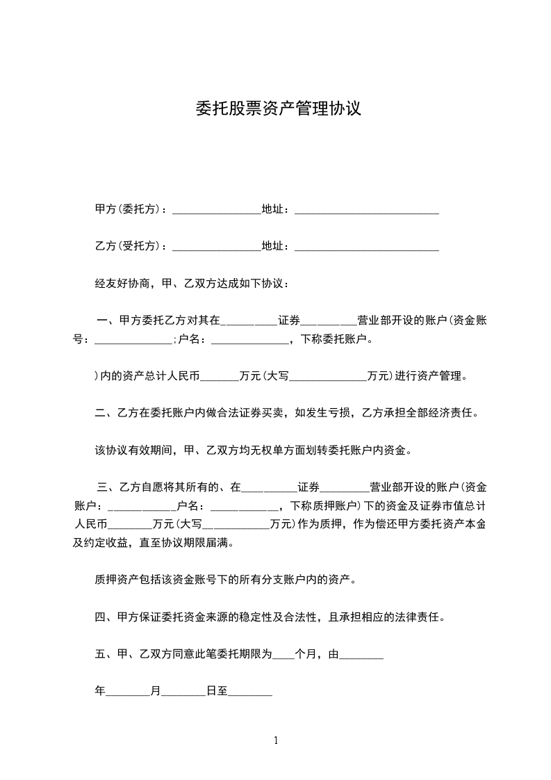 三、乙方自愿将其所有的、在__________证券_________营业部开设的账户(资金账户:____________户名:____________,下称质押账户)下的资金及证券市值总计人民币________万元(大写____________万元)作为质押,作为偿还甲方委托资产本金及约定收益,直至协议期限届满。