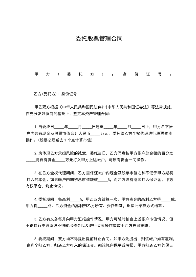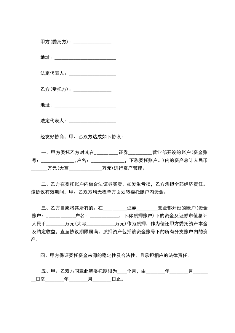 一、甲方委托乙方对其在__________证券__________营业部开设的账户(资金账号:______________;户名:______________,下称委托账户。