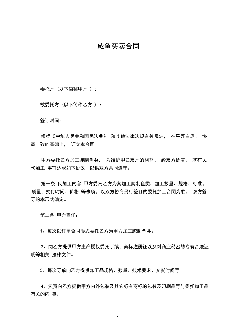 1、每次以订单合同形式委托乙方为甲方加工腌制鱼类。