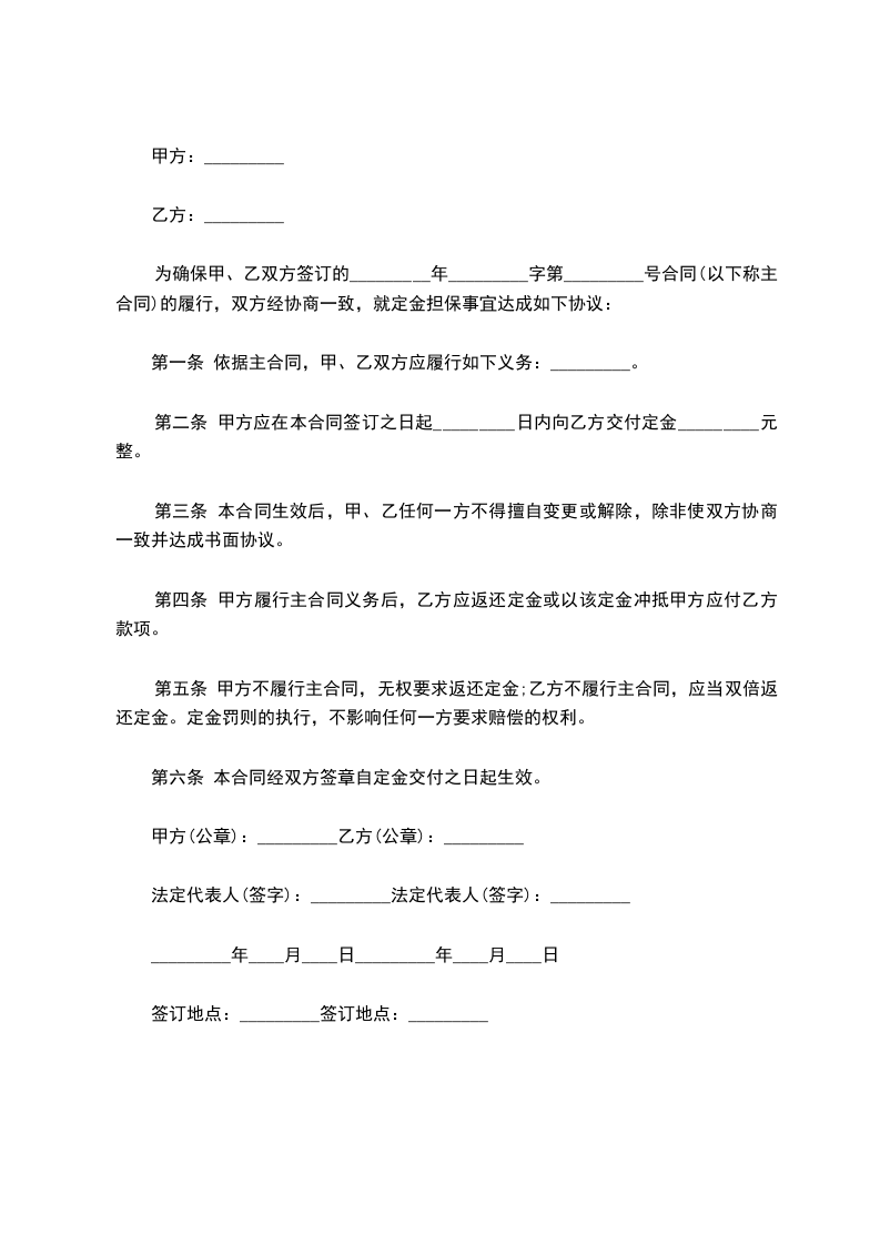 为确保甲、乙双方签订的_________年_________字第_________号合同(以下称主合同)的履行,双方经协商一致,就定金担保事宜达成如下协议: