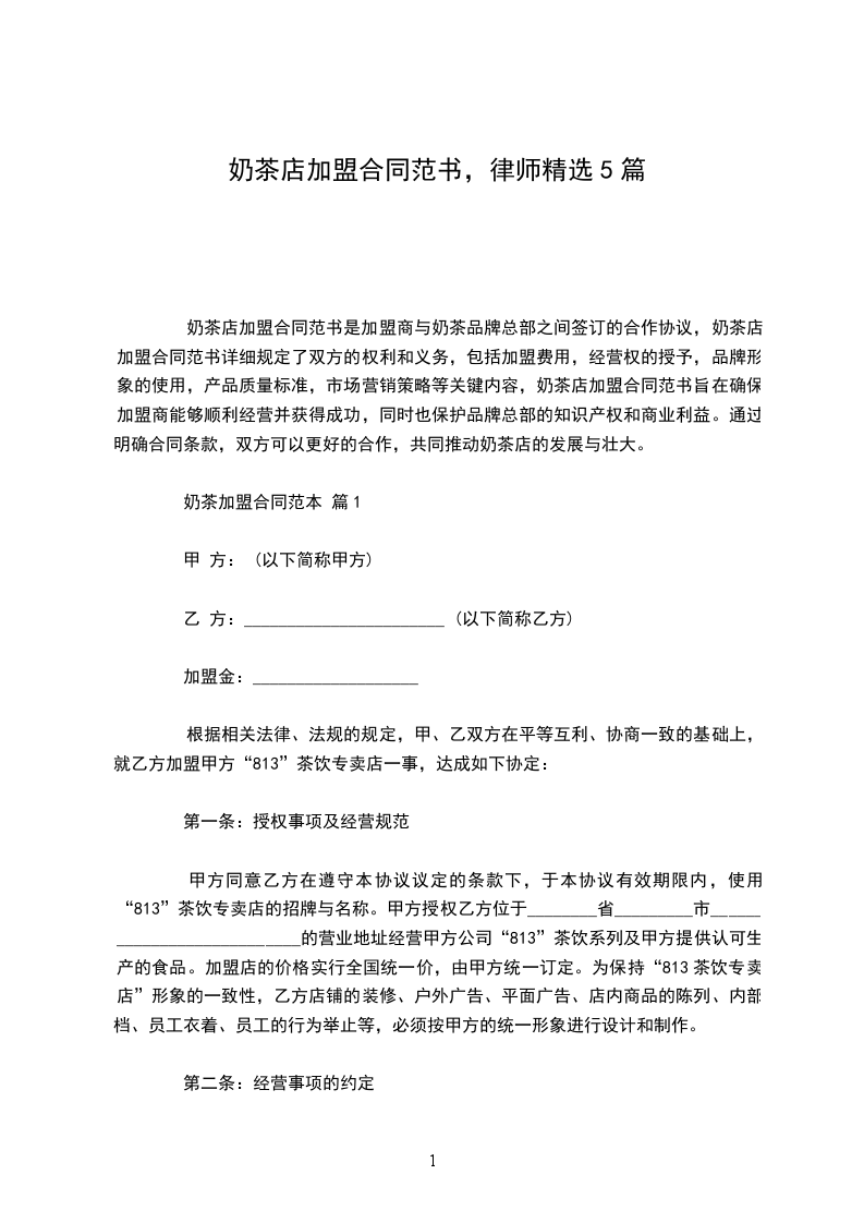 1. 甲方授权乙方在[具体地址]开设一家[奶茶品牌名称]奶茶加盟店(以下简称“加盟店”),授权期限自____年__月__日起至____年__月__日止。