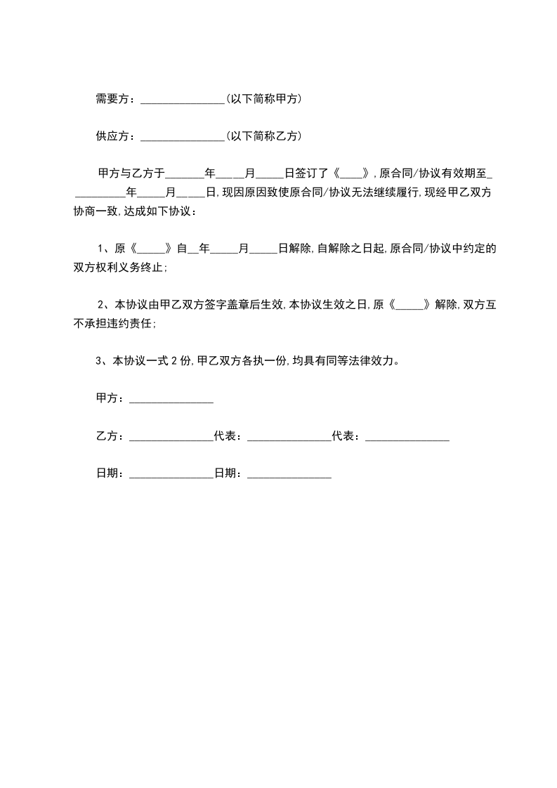 甲方与乙方于_______年_____月_____日签订了《____》,原合同/协议有效期至__________年_____月_____日,现因原因致使原合同/协议无法继续履行,现经甲乙双方协商一致,达成如下协议:
