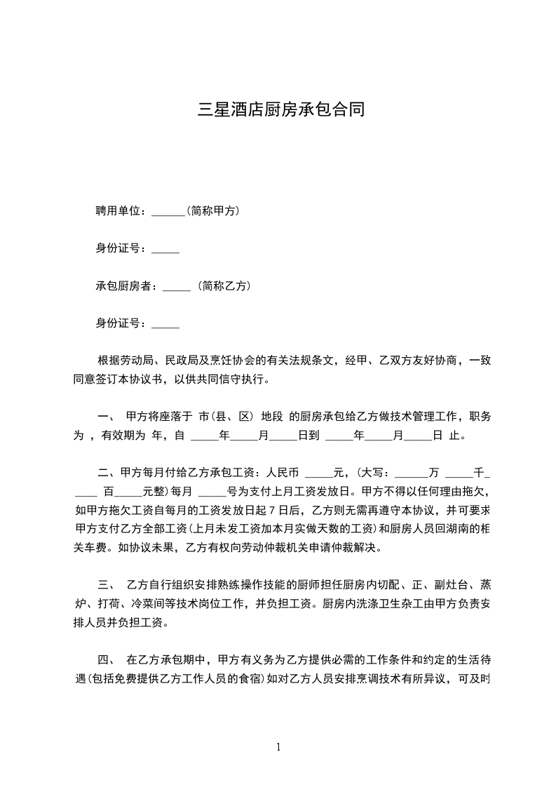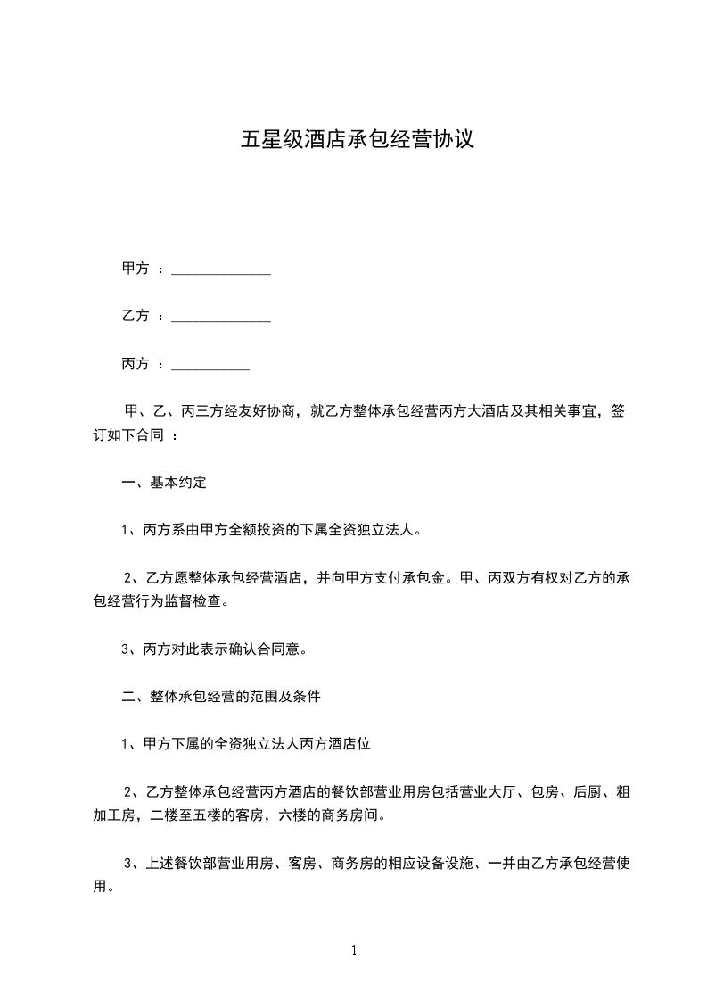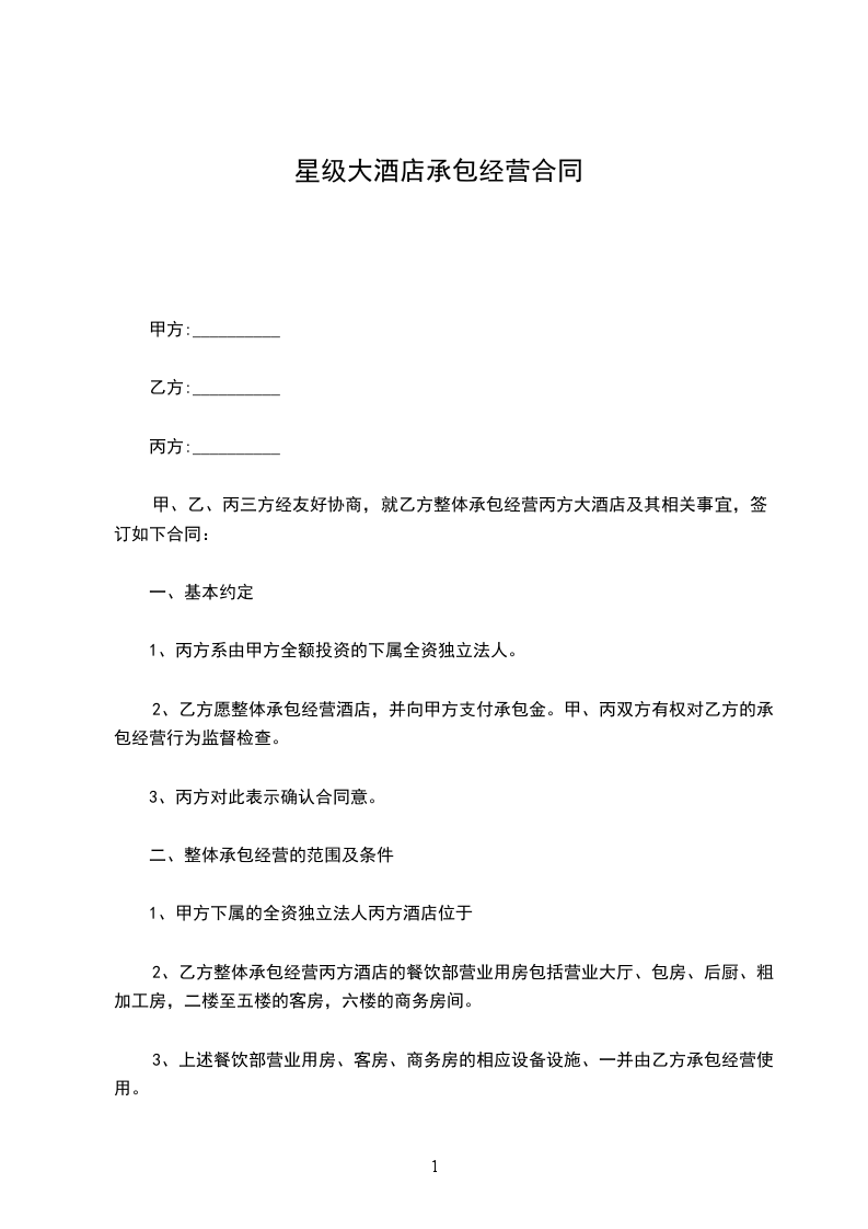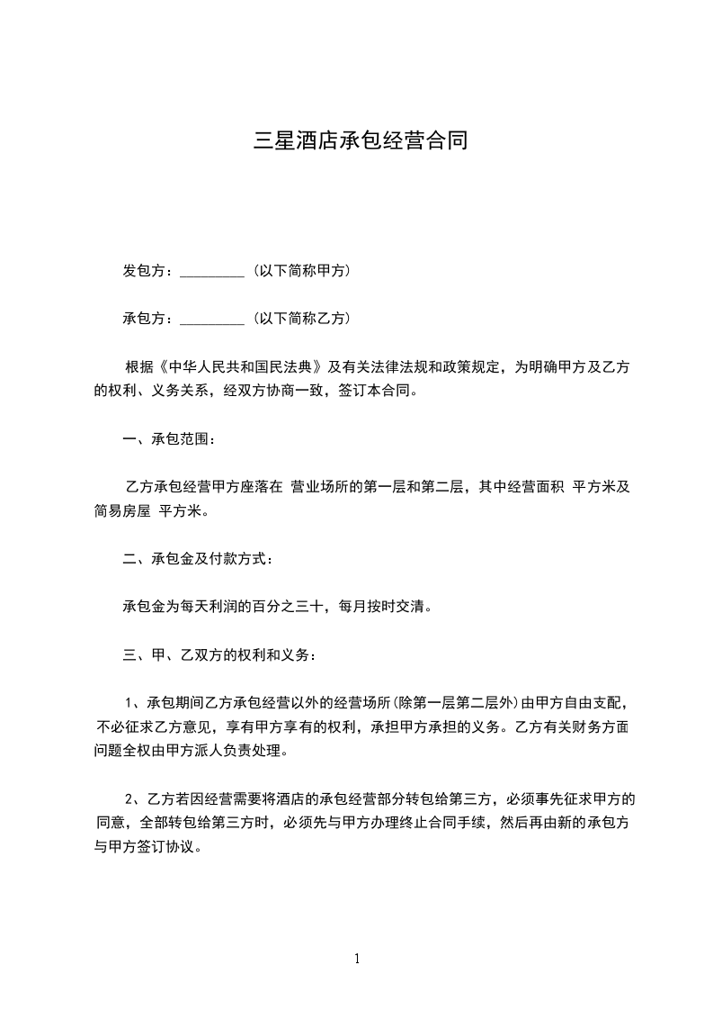 1、甲方提供给乙方承包经营的酒店位于____________市____________路___________号,面积共____________平方米。