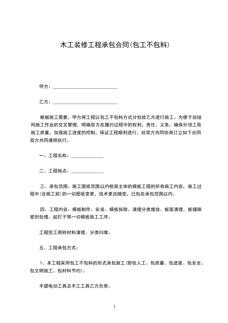 根据施工需要,甲方将工程以包工不包料方式分包给乙方进行施工。为便于班组间施工作业的交叉管理,明确双方在履约过程中的权利、责任、义务,确保分项工程施工质量,加强施工进度的控制,保证工程顺利进行,经双方共同协商订立如下合同,双方共同遵照执行。
