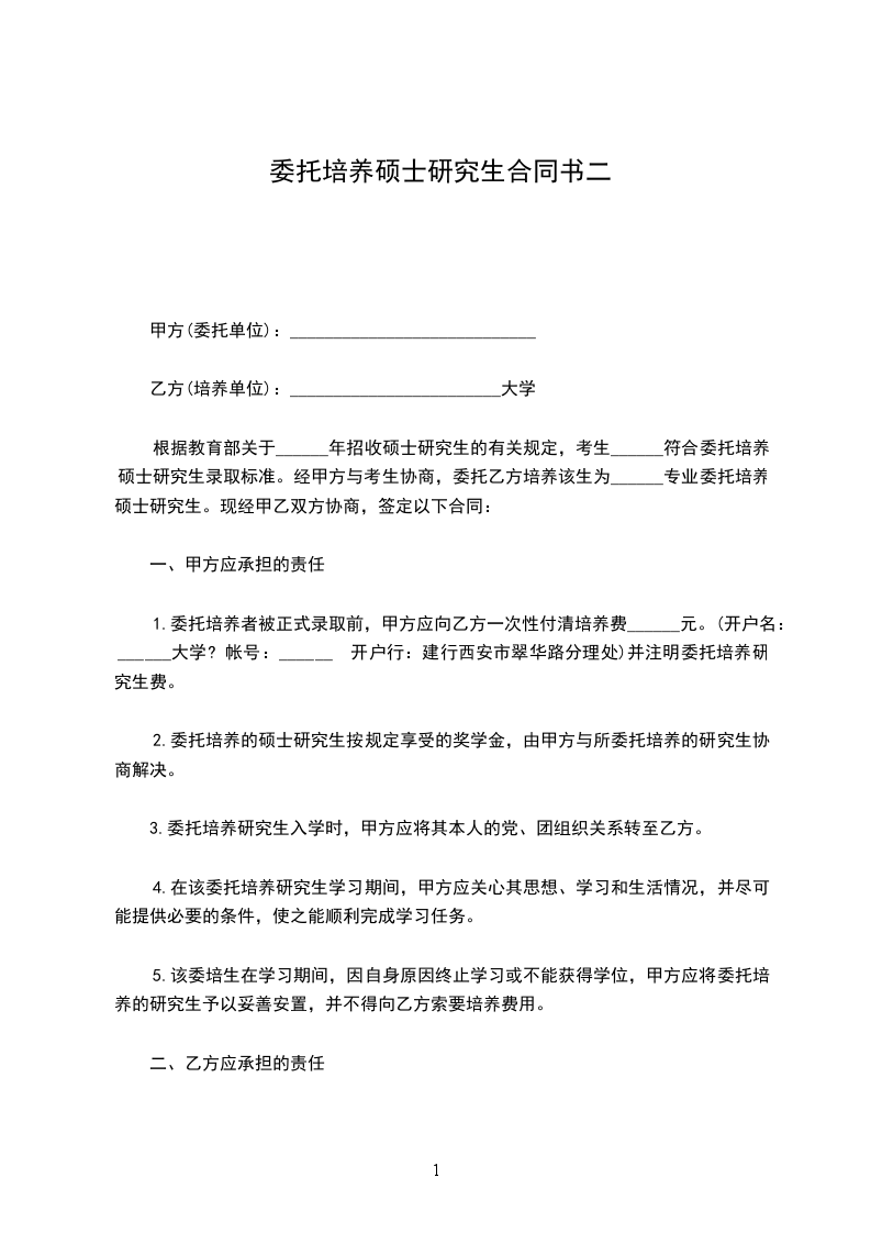 1.委托培养者被正式录取前,甲方应向乙方一次性付清培养费______元。(开户名:______大学? 帐号:______ 开户行:建行西安市翠华路分理处)并注明委托培养研究生费。