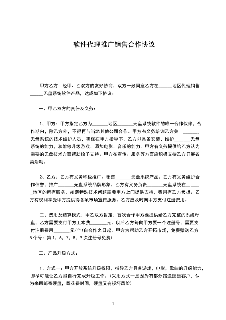 经甲、乙双方的友好协商,双方一致同意乙方在_______地区代理销售_______无盘系统软件产品,达成如下协议: