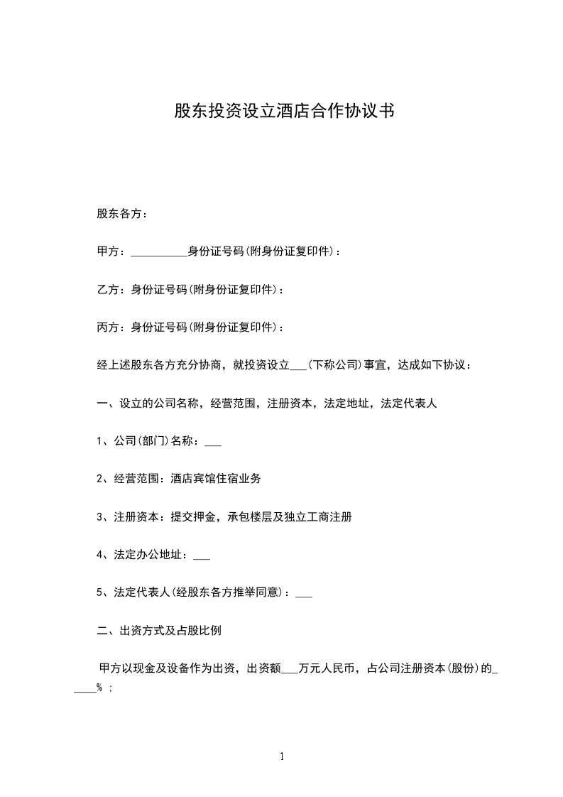 1. 甲方投资人民币______元,占股比例为______%。