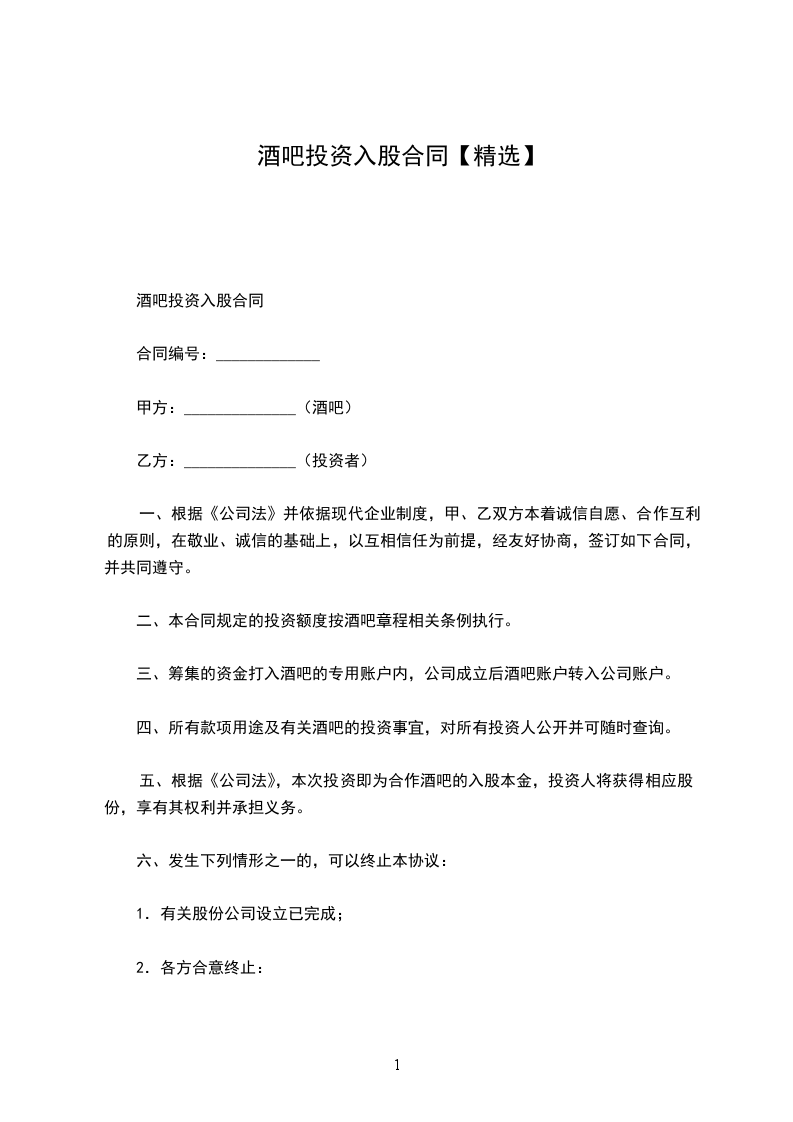1. 甲方以现金方式出资人民币______元,占目标酒吧股权比例为______%。