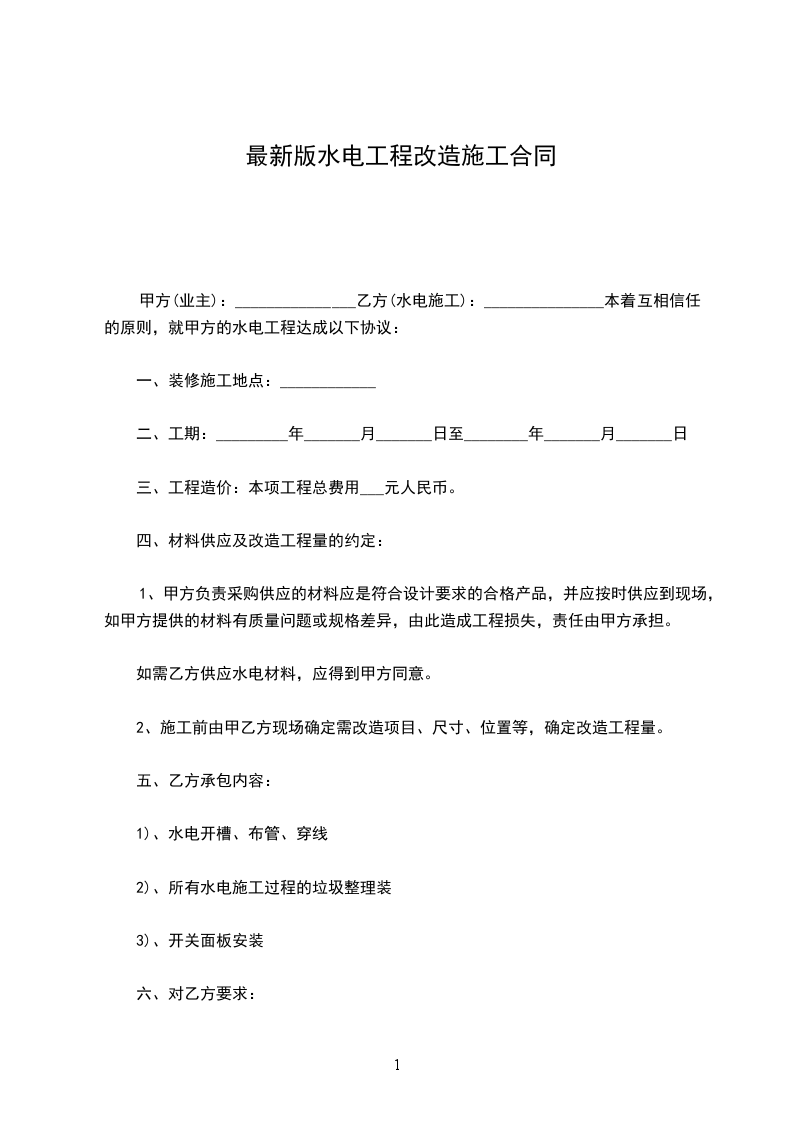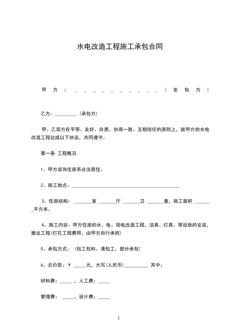 甲方(业主):_______________乙方(水电施工):_______________本着互相信任的原则,就甲方的水电工程达成以下协议: