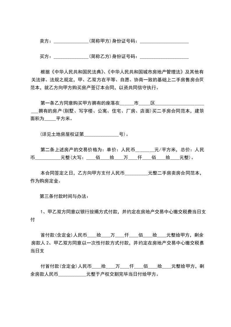 2、甲乙双方同意以一次性付款方式付款,并约定在房地产交易中心缴交税费当日支付首付款(含定金)人民币____拾____万____仟____佰____拾____元整给甲方,剩余房款人民币____________元整于产权交割完毕当日付给甲方。