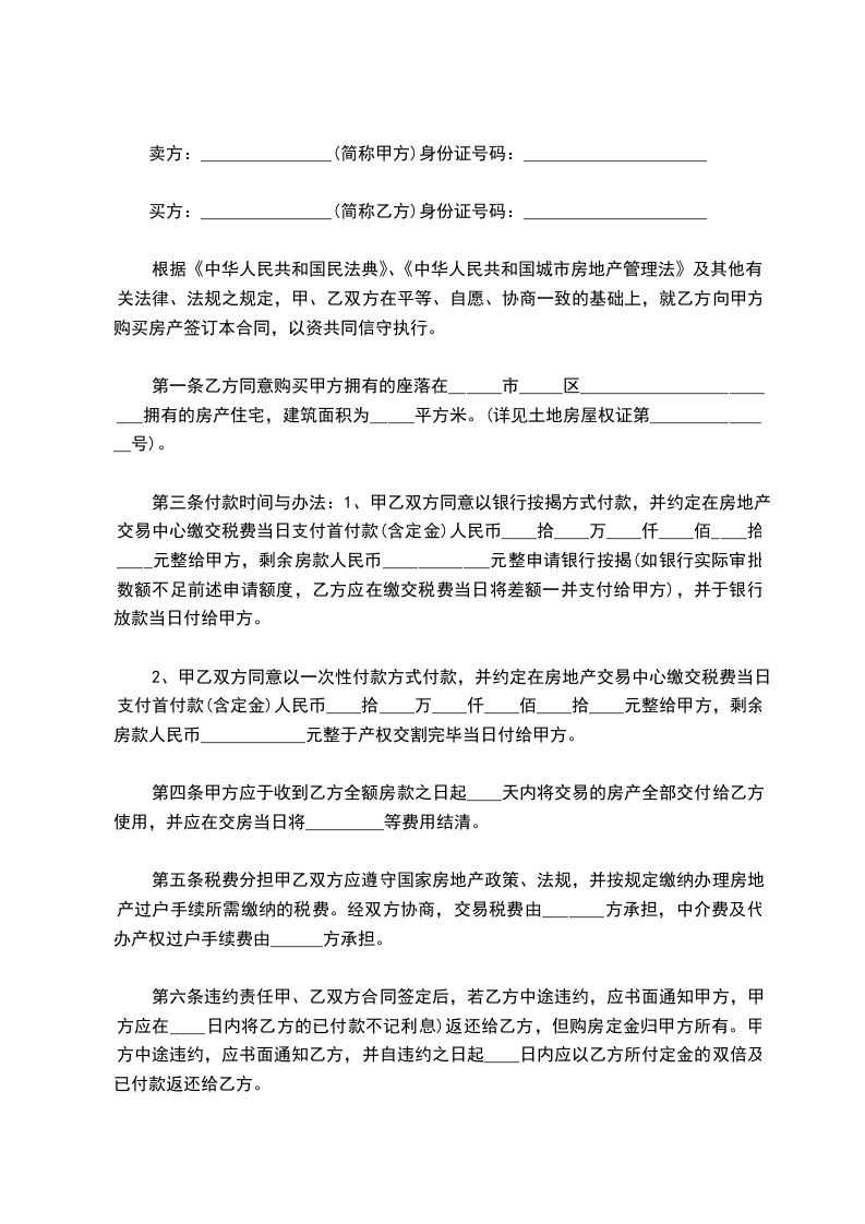第一条乙方同意购买甲方拥有的座落在______市_____区________________________拥有的房产住宅,建筑面积为_____平方米。(详见土地房屋权证第_______________号)。