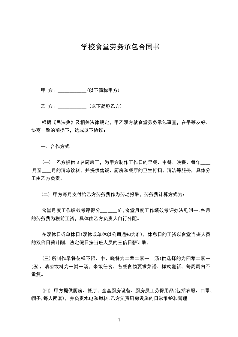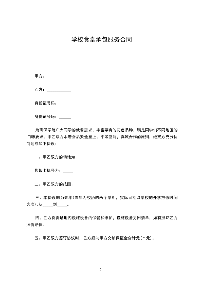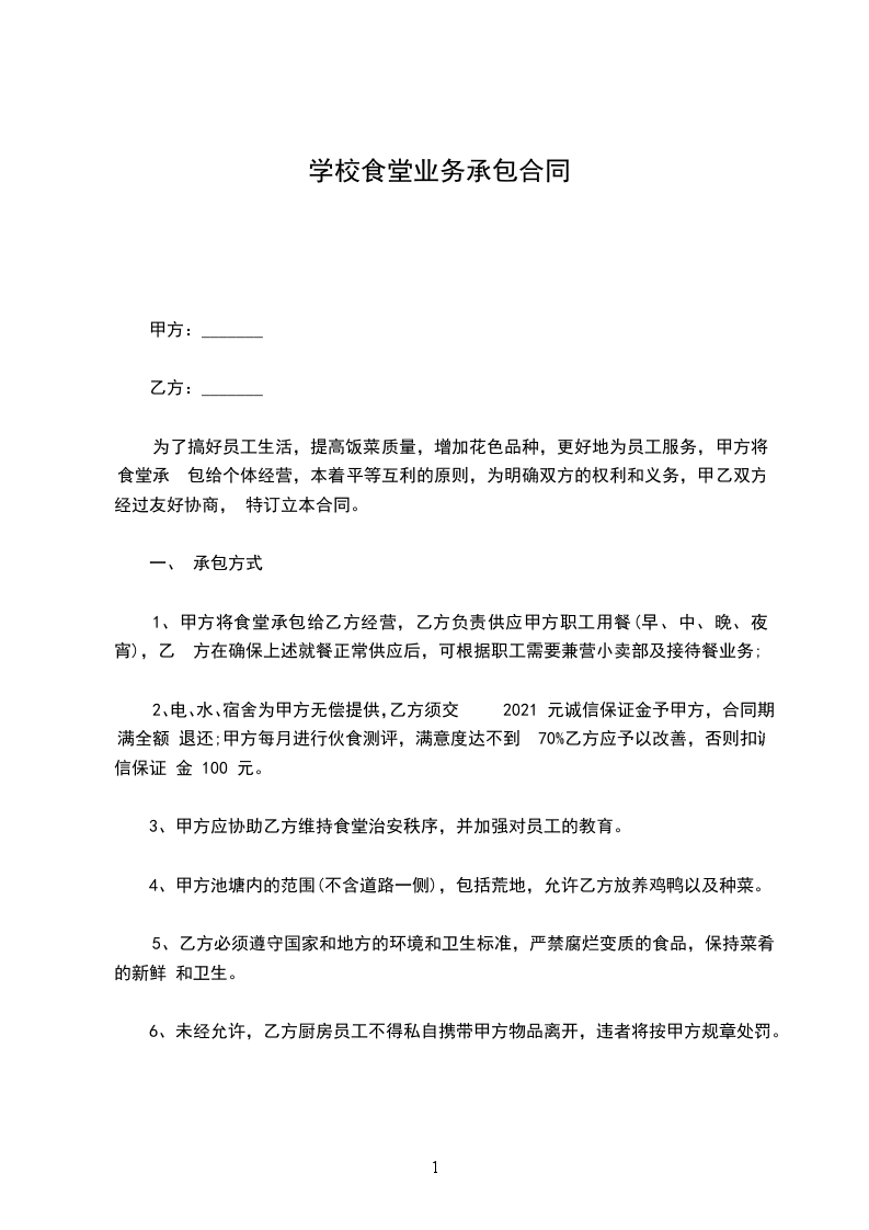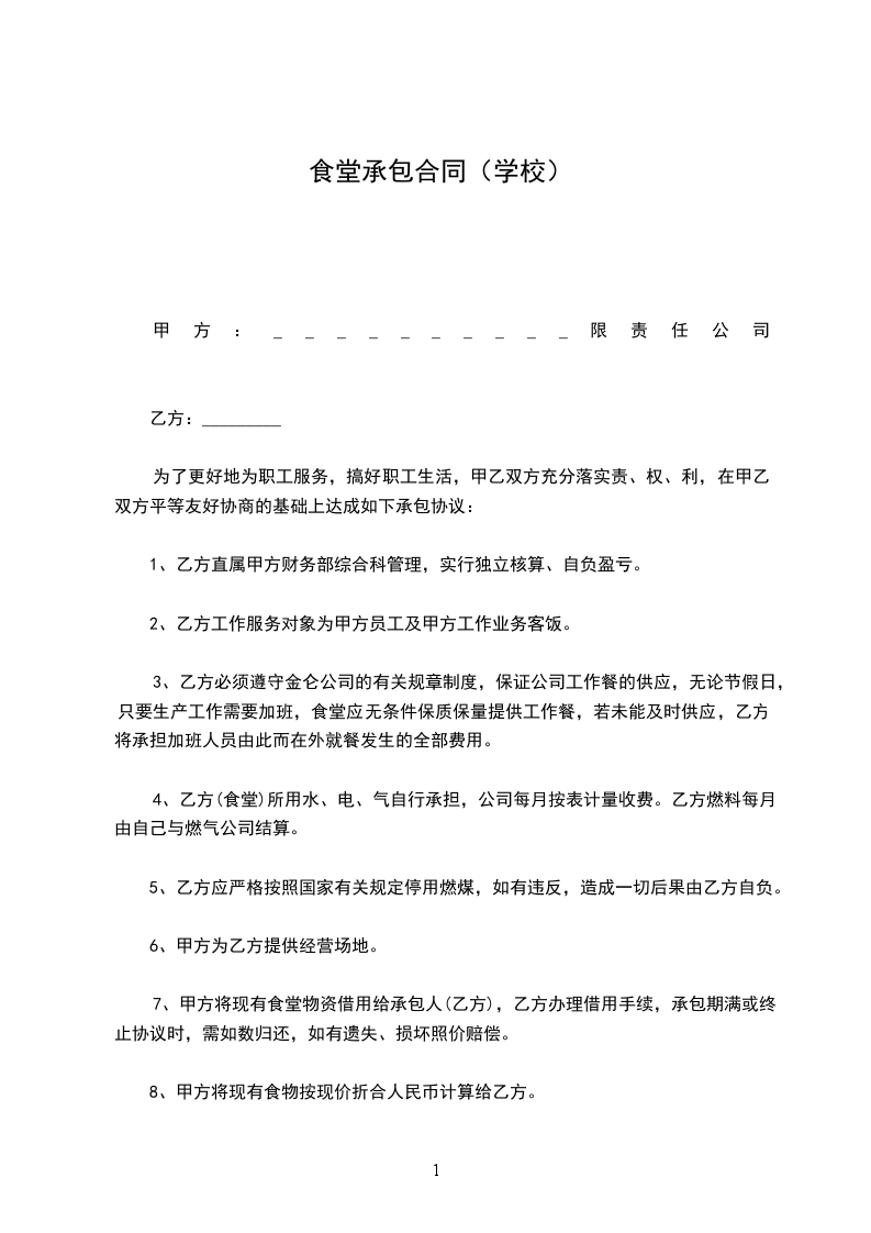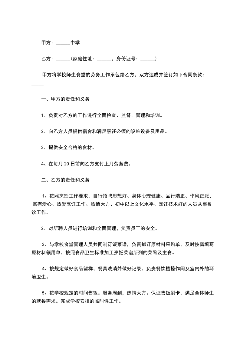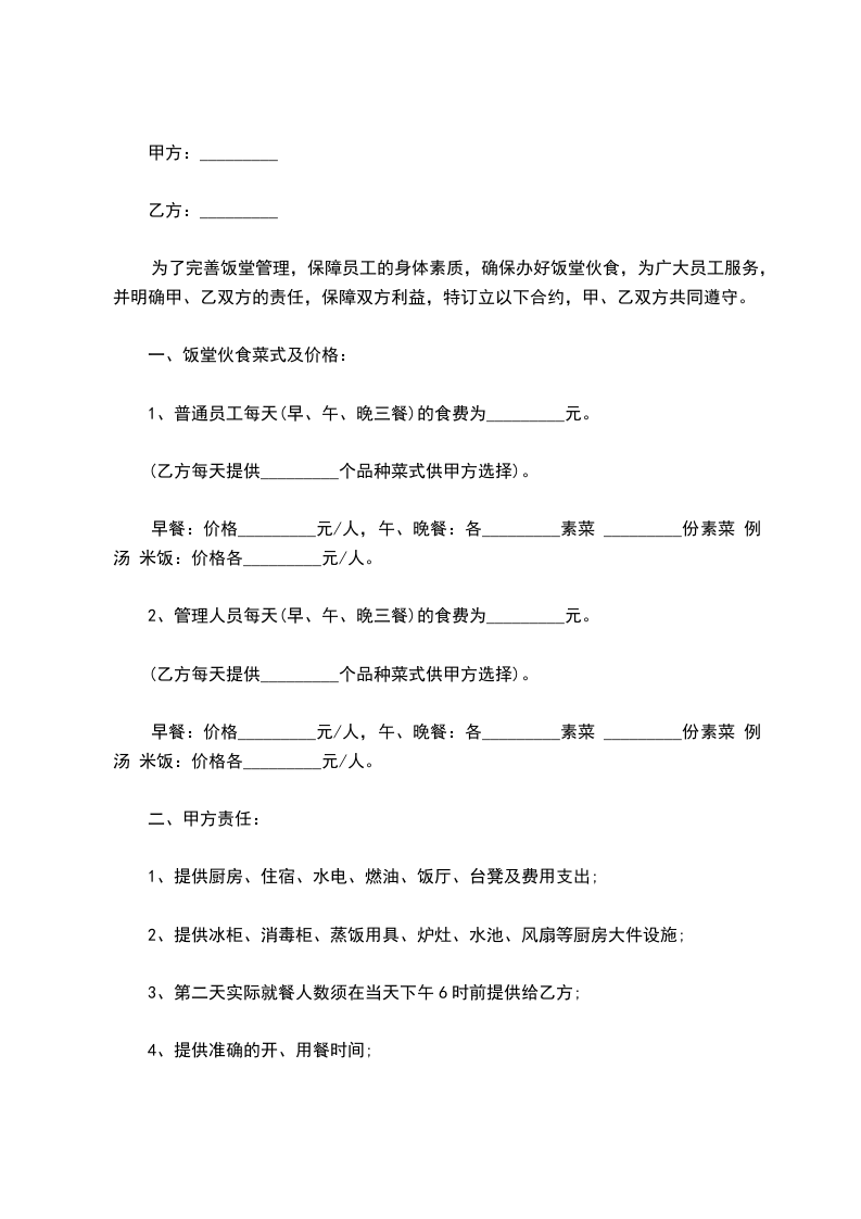 为了完善饭堂管理,保障员工的身体素质,确保办好饭堂伙食,为广大员工服务,并明确甲、乙双方的责任,保障双方利益,特订立以下合约,甲、乙双方共同遵守。