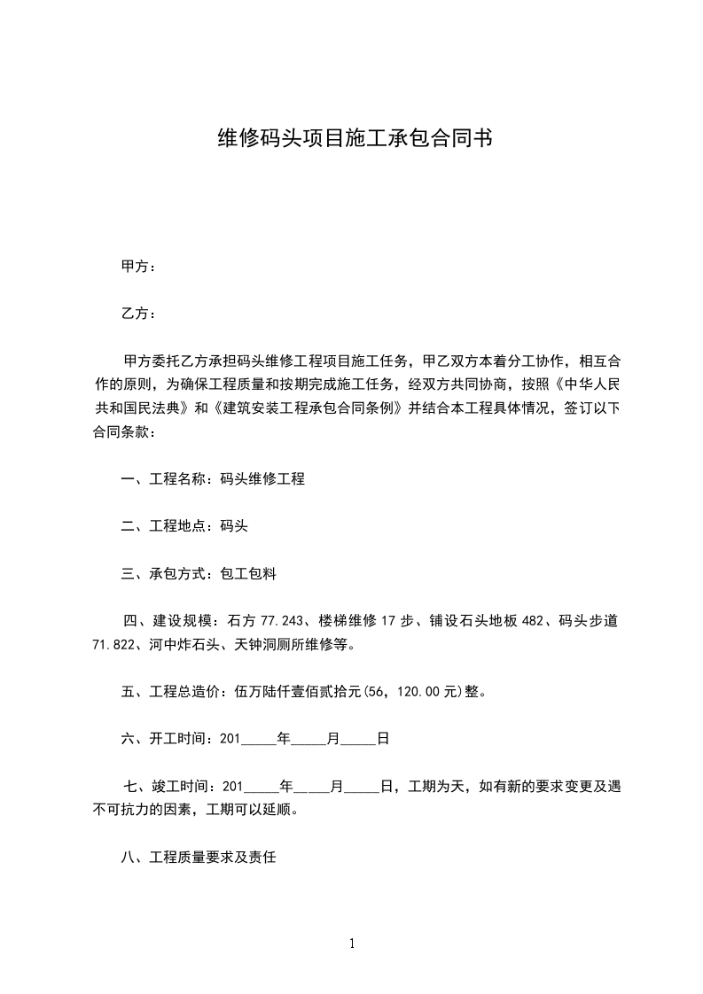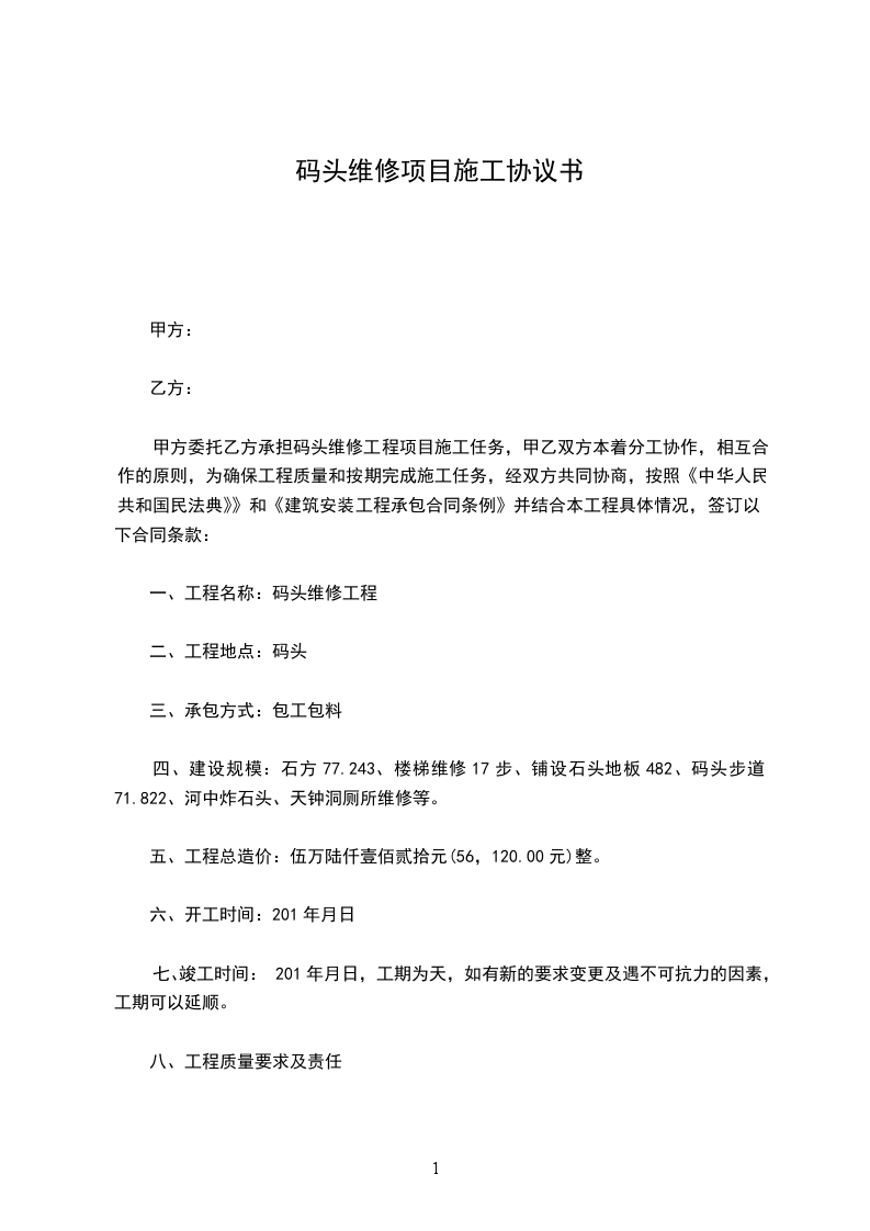 甲方委托乙方承担码头维修工程项目施工任务,甲乙双方本着分工协作,相互合作的原则,为确保工程质量和按期完成施工任务,经双方共同协商,按照《中华人民共和国民法典》和《建筑安装工程承包合同条例》并结合本工程具体情况,签订以下合同条款: