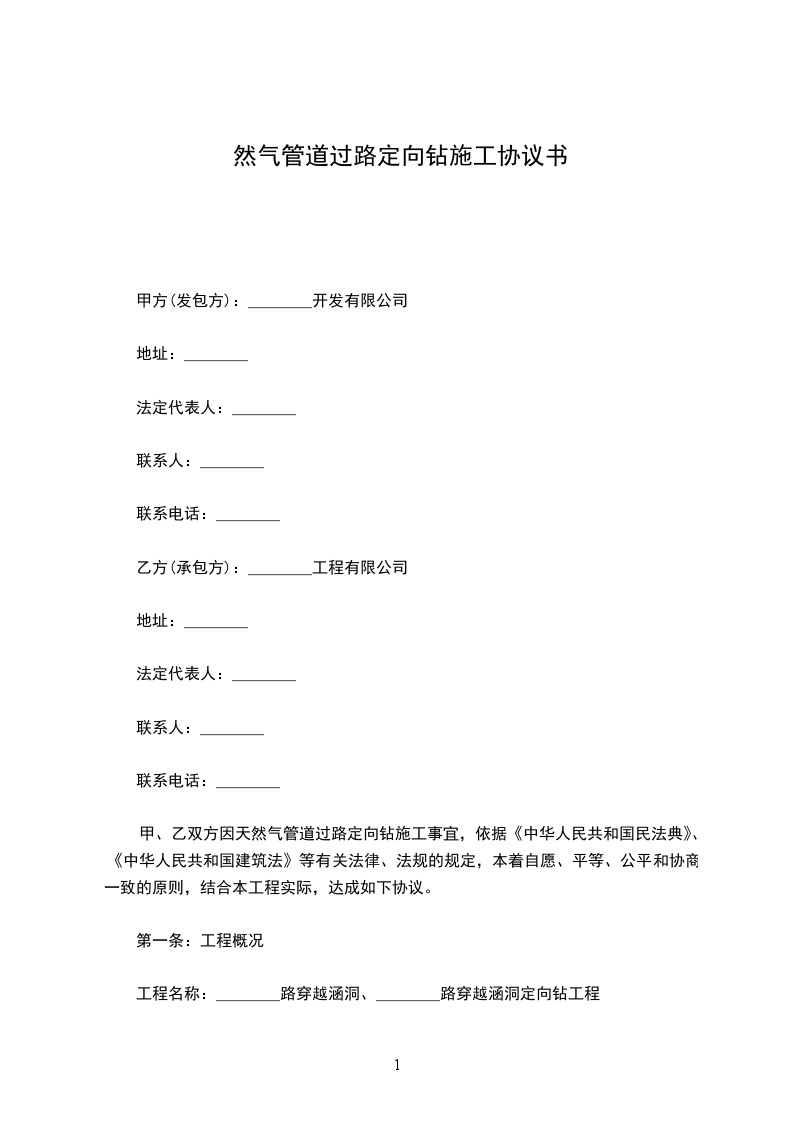 甲、乙双方因天然气管道过路定向钻施工事宜,依据《中华人民共和国民法典》、《中华人民共和国建筑法》等有关法律、法规的规定,本着自愿、平等、公平和协商一致的原则,结合本工程实际,达成如下协议。