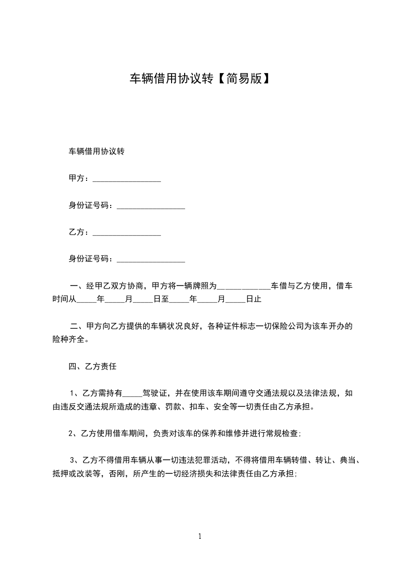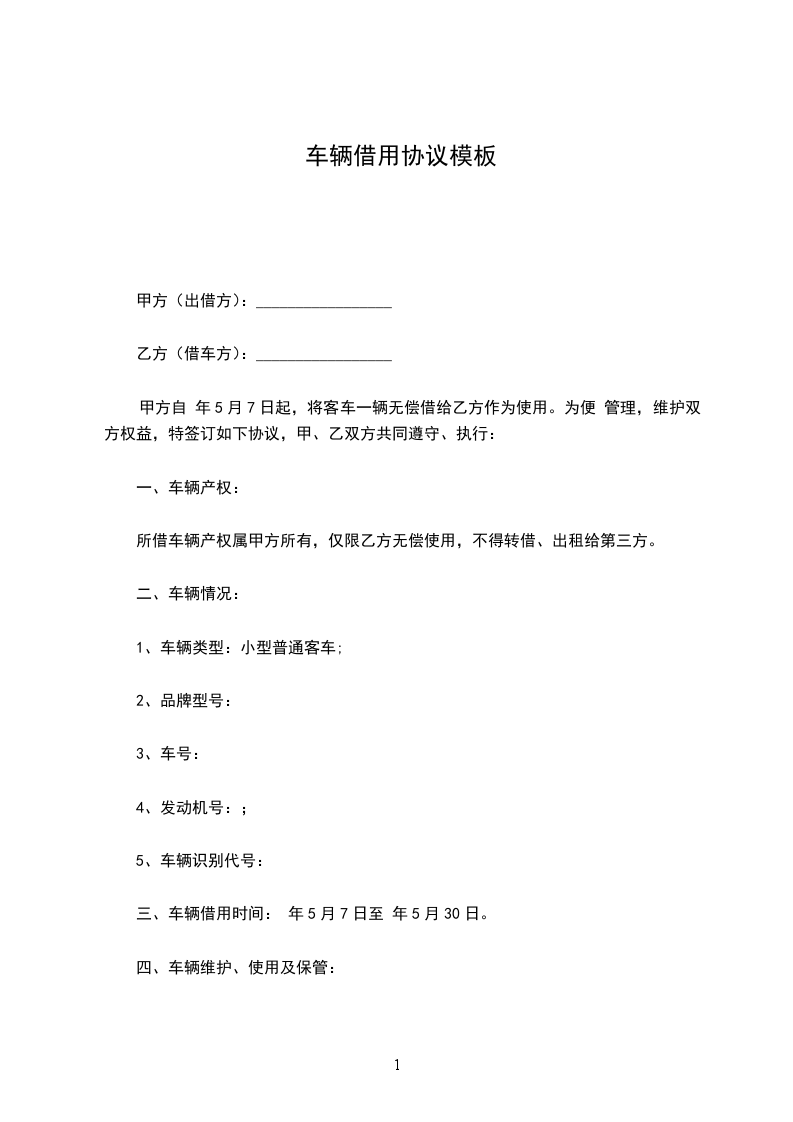1. 甲方将其所有的上述车辆转借乙方使用,转借期间自____年__月__日起至____年__月__日止。