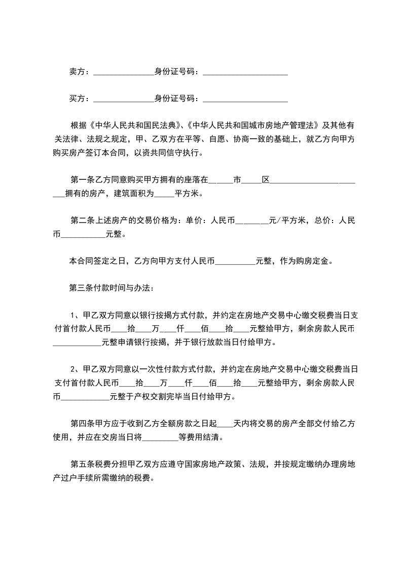 2、甲乙双方同意以一次性付款方式付款,并约定在房地产交易中心缴交税费当日支付首付款人民币____拾____万____仟____佰____拾____元整给甲方,剩余房款人民币____________元整于产权交割完毕当日付给甲方。