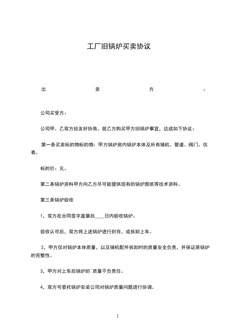 公司甲、乙双方经友好协商,就乙方购买甲方旧锅炉事宜,达成如下协议: