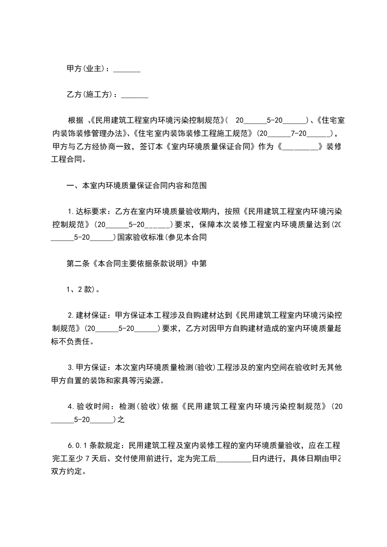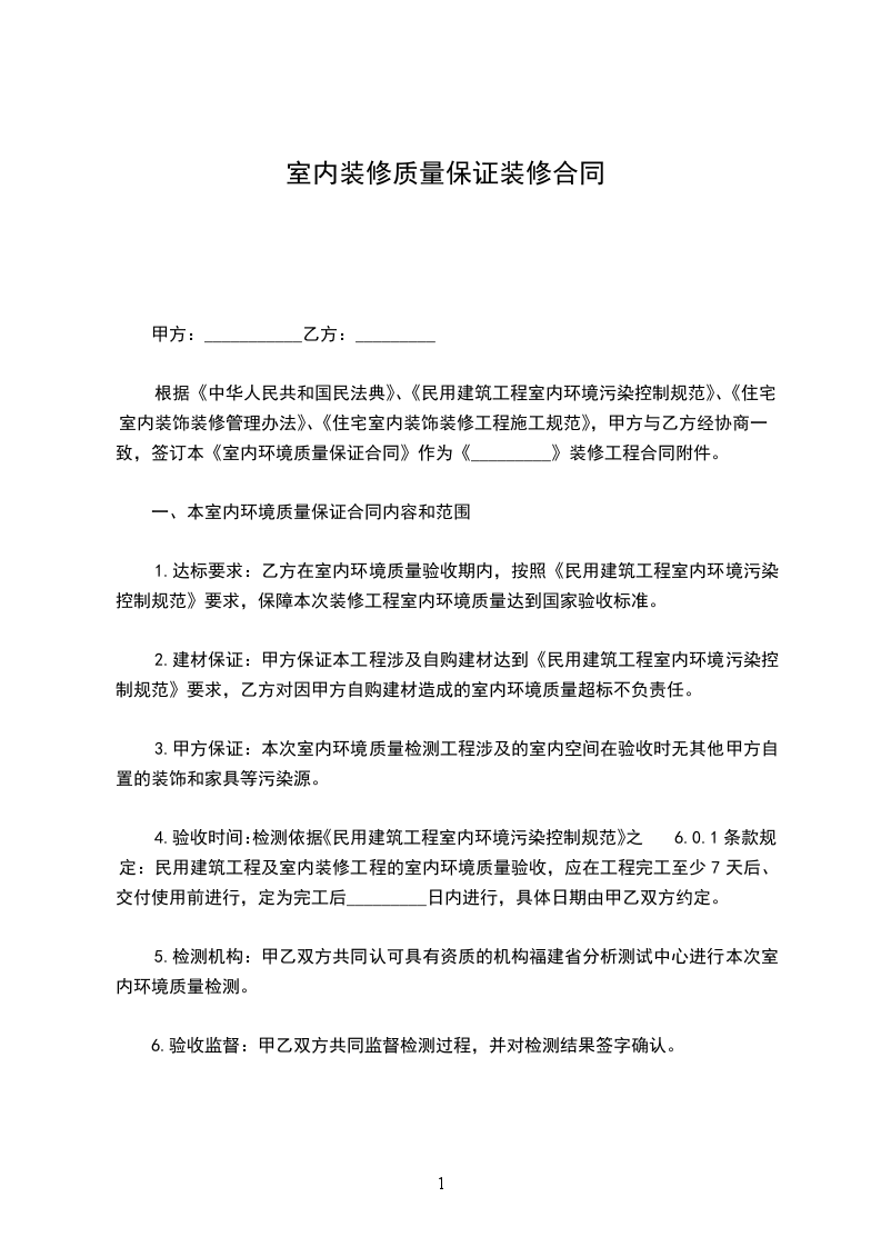 根据《中华人民共和国民法典》、《民用建筑工程室内环境污染控制规范》、《住宅室内装饰装修管理办法》、《住宅室内装饰装修工程施工规范》,甲方与乙方经协商一致,签订本《室内环境质量保证合同》作为《_________》装修工程合同附件。