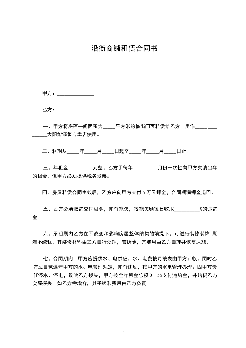 一、甲方将座落一间面积为_____平方米的临街门面租赁给乙方,用作_______________太阳能销售专卖店使用。