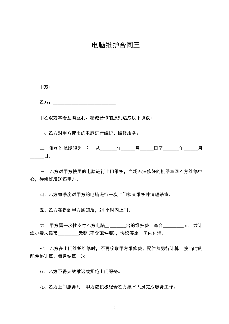 一、乙方对甲方使用的电脑进行维护、维修服务。