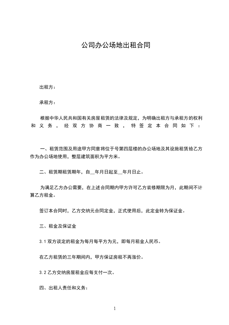 一、租赁范围及用途甲方同意将位于号第四层楼的办公场地及其设施租赁给乙方作为办公场地使用,整层建筑面积为_____平方米。