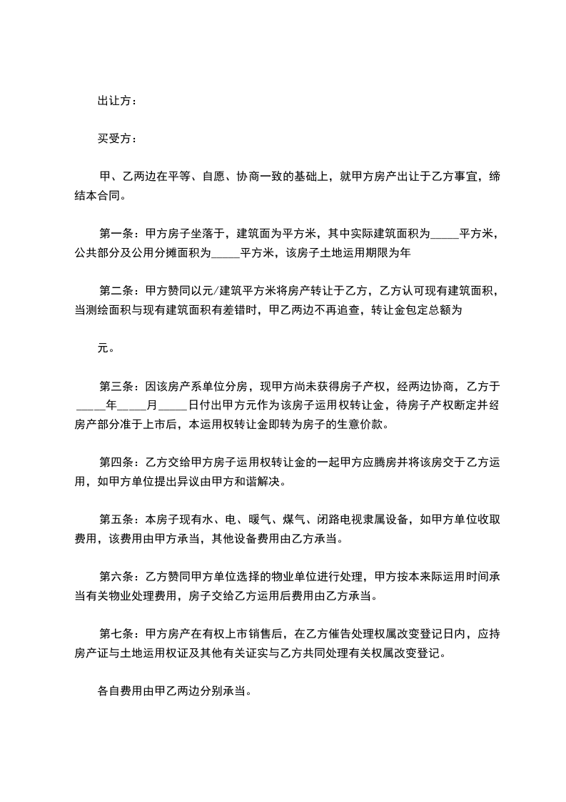 第三条:因该房产系单位分房,现甲方尚未获得房子产权,经两边协商,乙方于_____年_____月_____日付出甲方元作为该房子运用权转让金,待房子产权断定并经房产部分准于上市后,本运用权转让金即转为房子的生意价款。