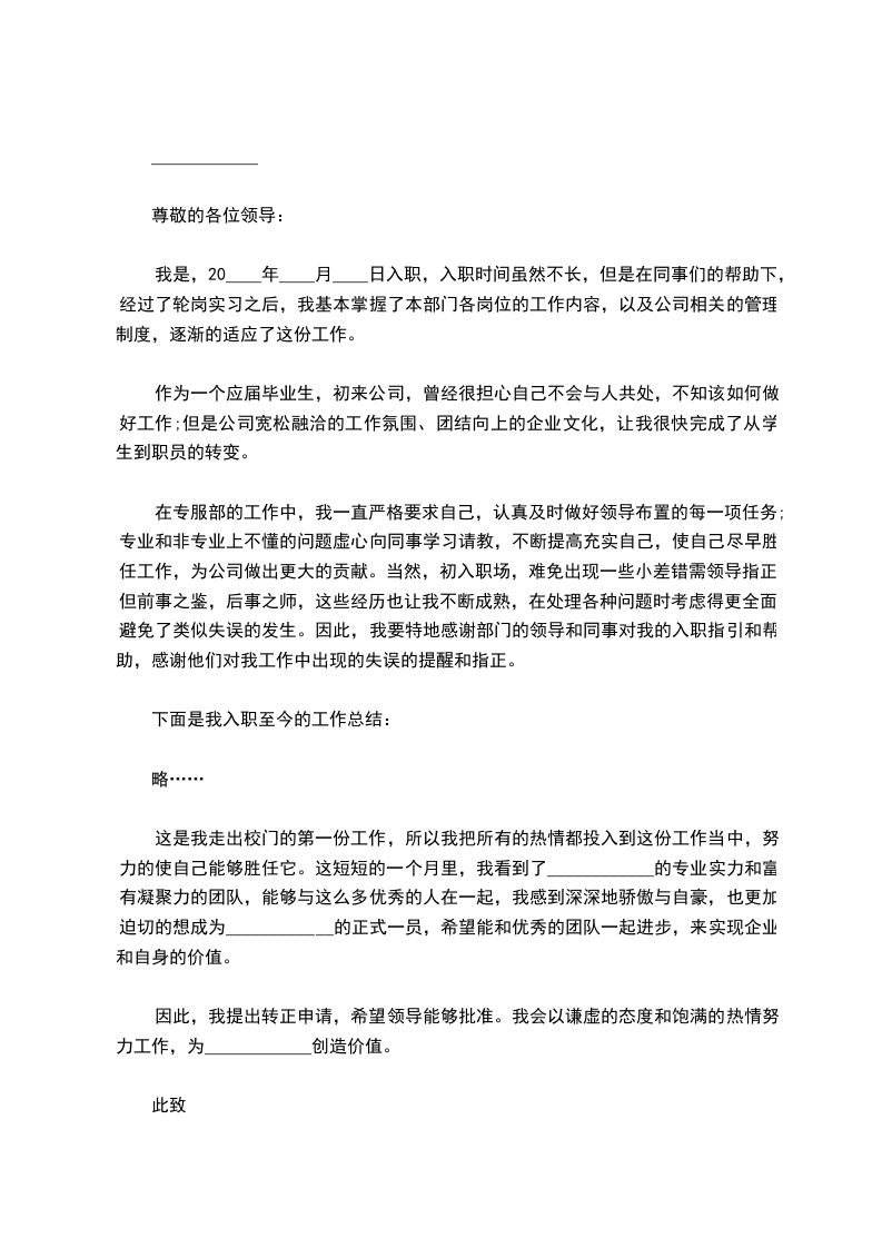 因此,我提出转正申请,希望领导能够批准。我会以谦虚的态度和饱满的热情努力工作,为____________创造价值。