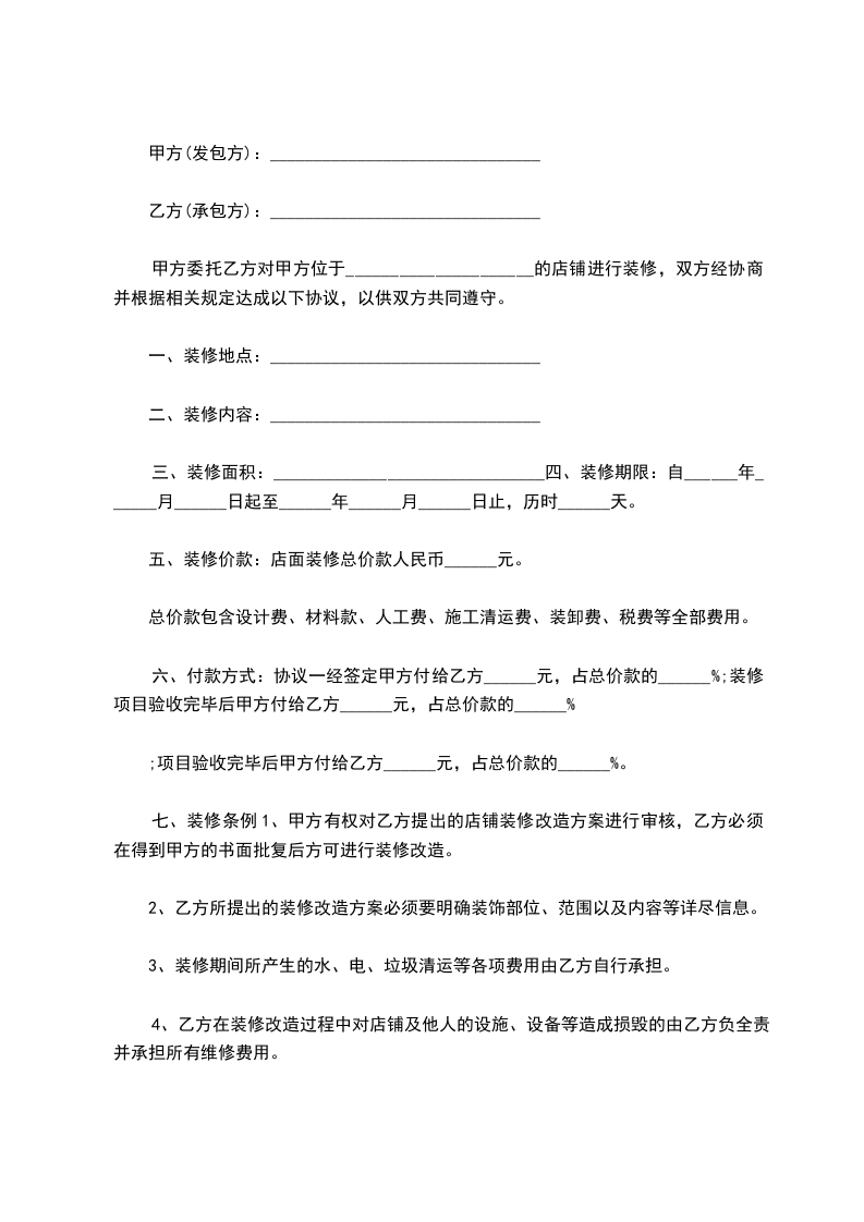 甲方委托乙方对甲方位于_____________________的店铺进行装修,双方经协商并根据相关规定达成以下协议,以供双方共同遵守。