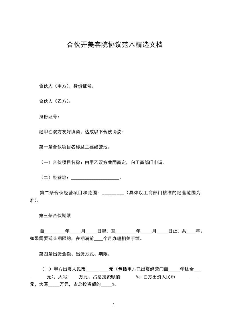 鉴于合伙人 1 和合伙人 2 有意共同经营一家美容院,经友好协商,达成以下合伙协议:
