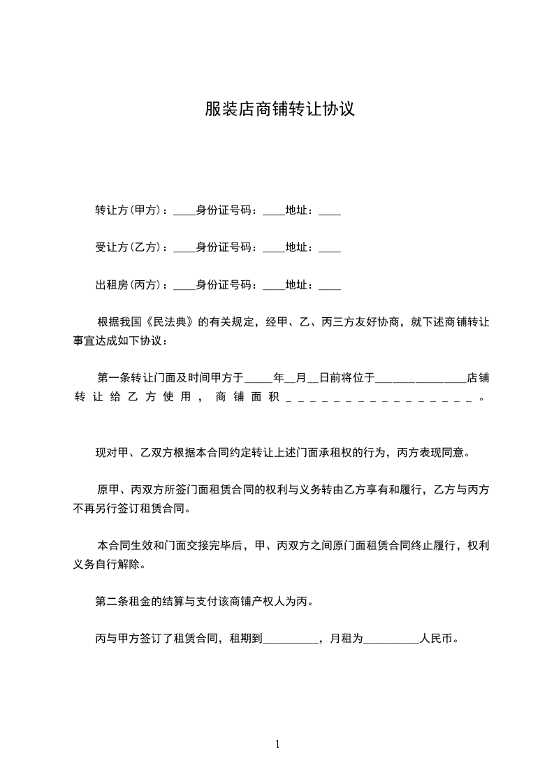 根据我国《民法典》的有关规定,经甲、乙、丙三方友好协商,就下述商铺转让事宜达成如下协议: