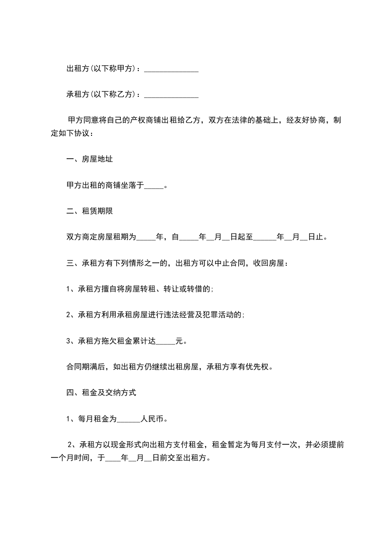 甲方同意将自己的产权商铺出租给乙方,双方在法律的基础上,经友好协商,制定如下协议: