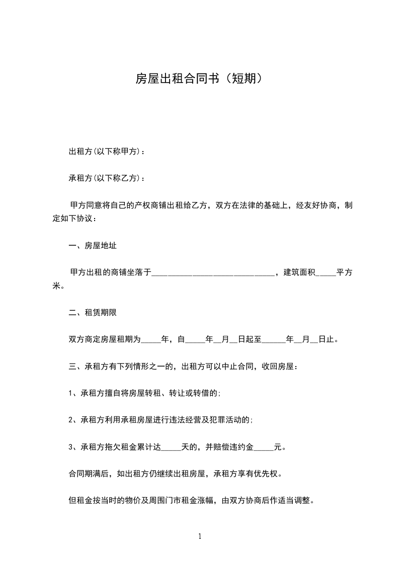 1、若出租方在承租方没有违反本合同的情况下提前解除合同或租给他人,视为甲方违约,负责赔偿违约金_____元。