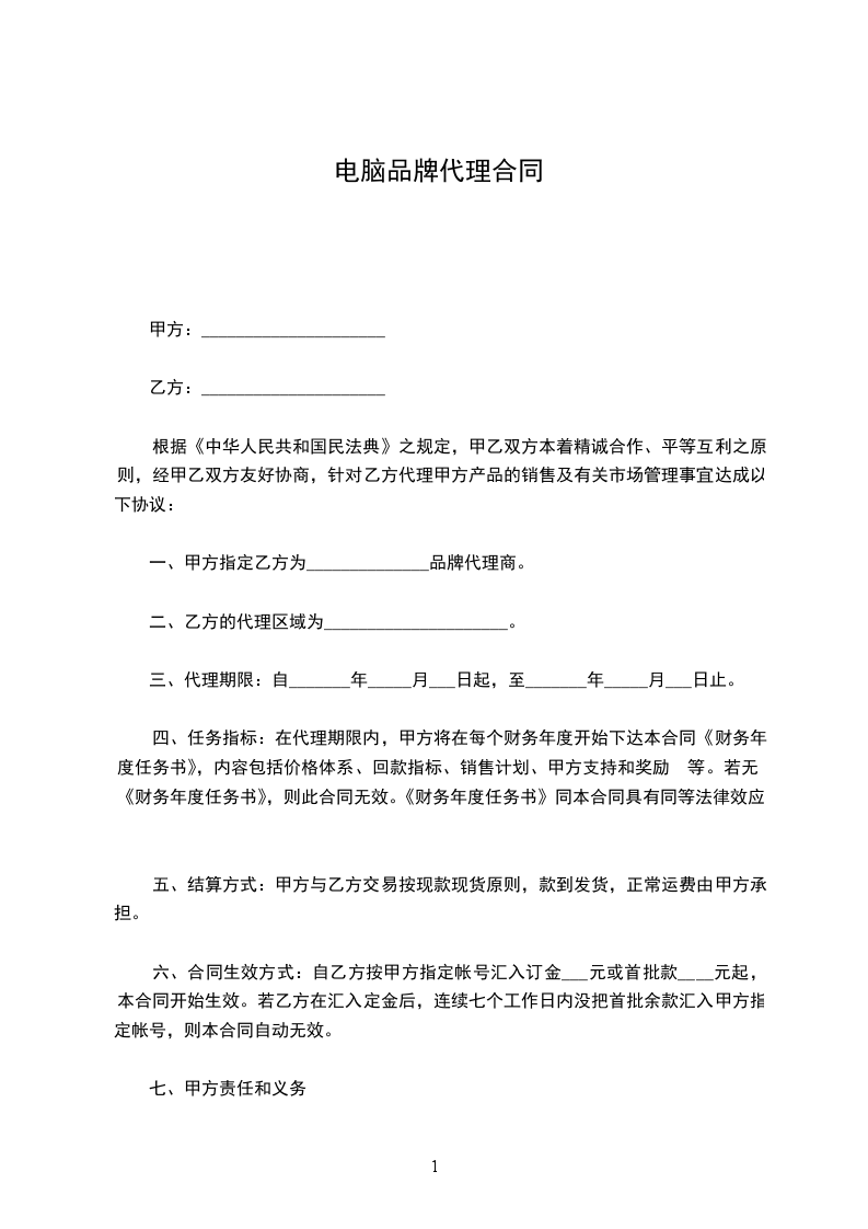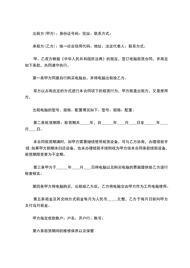 甲、乙双方根据《中华人民共和国民法典》的规定,签订电脑租赁合同,并商定如下条款,共同遵守执行。