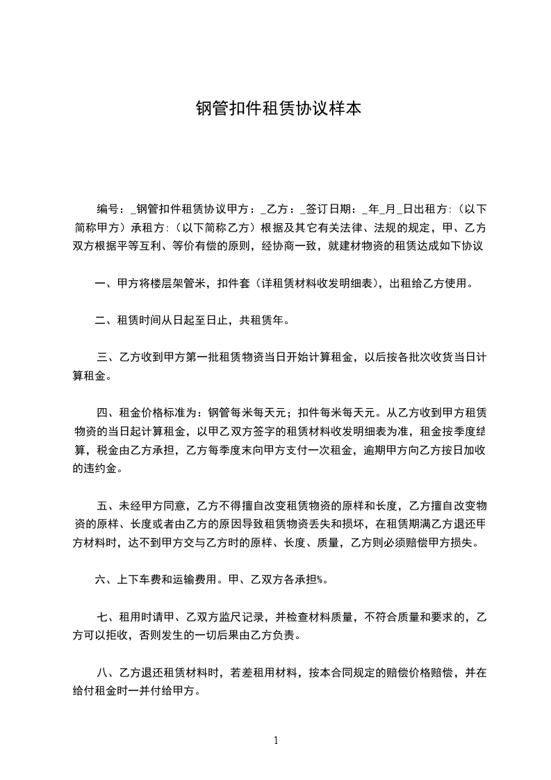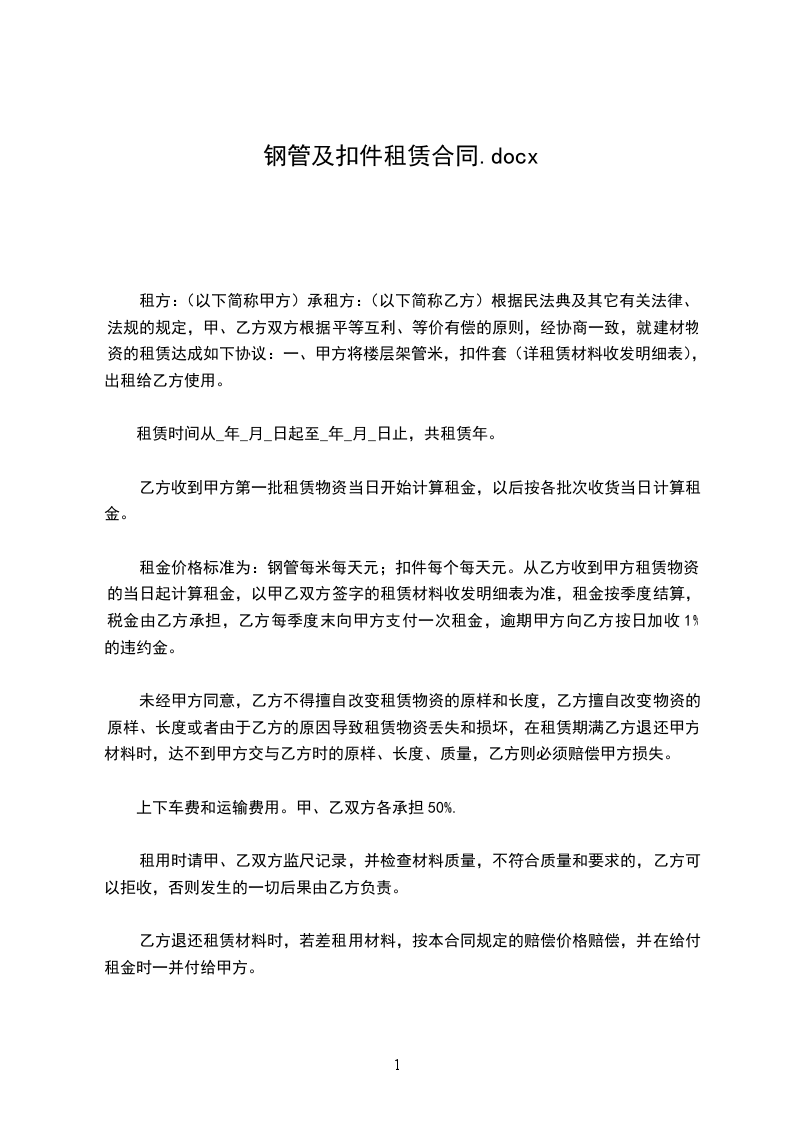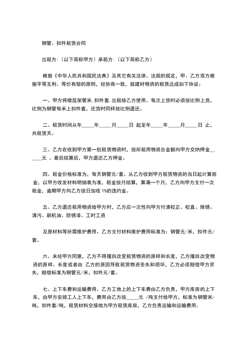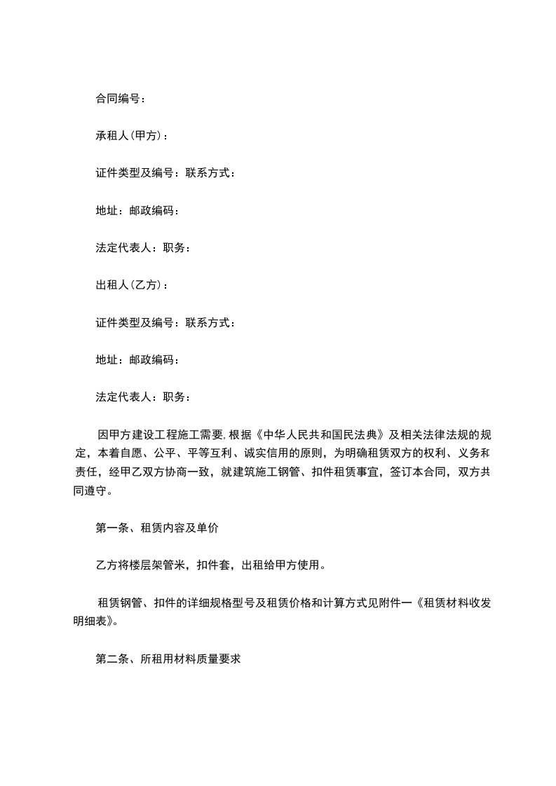 因甲方建设工程施工需要,根据《中华人民共和国民法典》及相关法律法规的规定,本着自愿、公平、平等互利、诚实信用的原则,为明确租赁双方的权利、义务和责任,经甲乙双方协商一致,就建筑施工钢管、扣件租赁事宜,签订本合同,双方共同遵守。