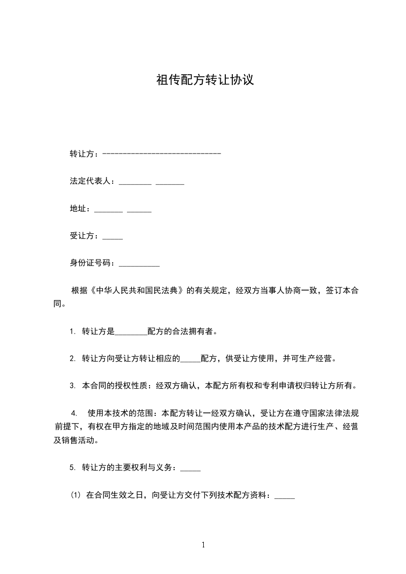 鉴于甲方拥有[配方名称]的配方(以下简称“该配方”),并愿意将其转让给乙方,乙方愿意受让该配方,双方经友好协商,依据《中华人民共和国民法典》等相关法律法规的规定,达成如下协议: