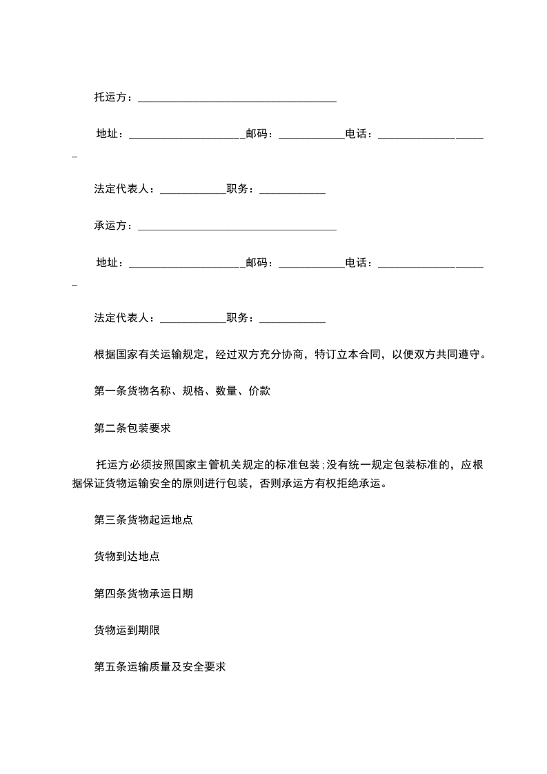 第二条货物运输定价自合同签订生效当年为人民币___元/吨,以后年份运费随行就市。甲方除支付上价格外,不再乙方支付任何其他费用(包括但不限于乙方装车、转运、卸货等产生的费用),但本合同另有约定的除外。