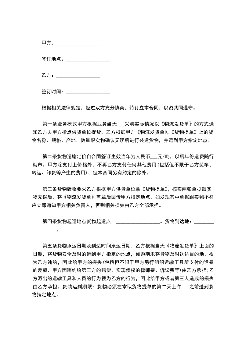 第七条运输费用、结算方式乙方将货运到甲方指定地点,甲方仓库管理人员在《物流发货单》上签字盖章后,乙方司机凭《物流发货单》去甲方财务办公室结算,每月___日和___日为结算日(遇法定节假日顺延)第八条各方的责任、义务