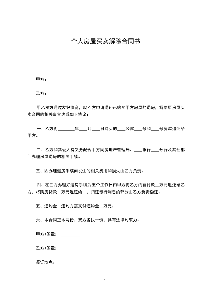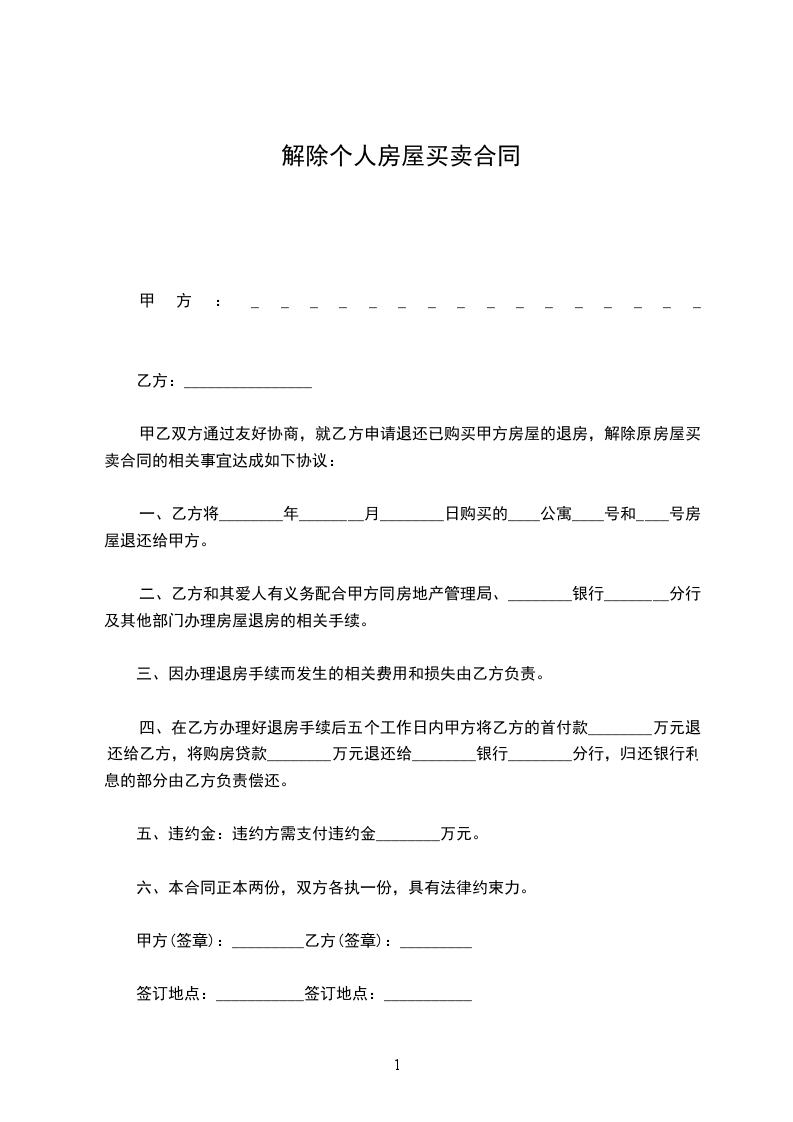 一、乙方将________年____月____日购买的____公寓____号和____号房屋退还给甲方。