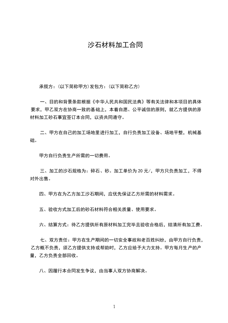 一、目的和背景条款根据《中华人民共和国民法典》等有关法律和本项目的具体要求,甲乙双方在协商一致的基础上,本着自愿、公平诚信的原则,就乙方提供的原材料加工砂石事宜签订本合同,以资共同遵守。