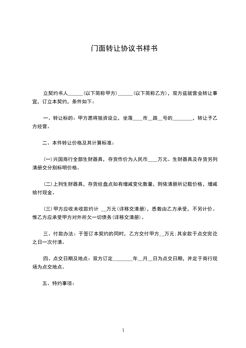一、转让标的:甲方愿将独资设立,坐落____市__路__号的________,转让予乙方经营。