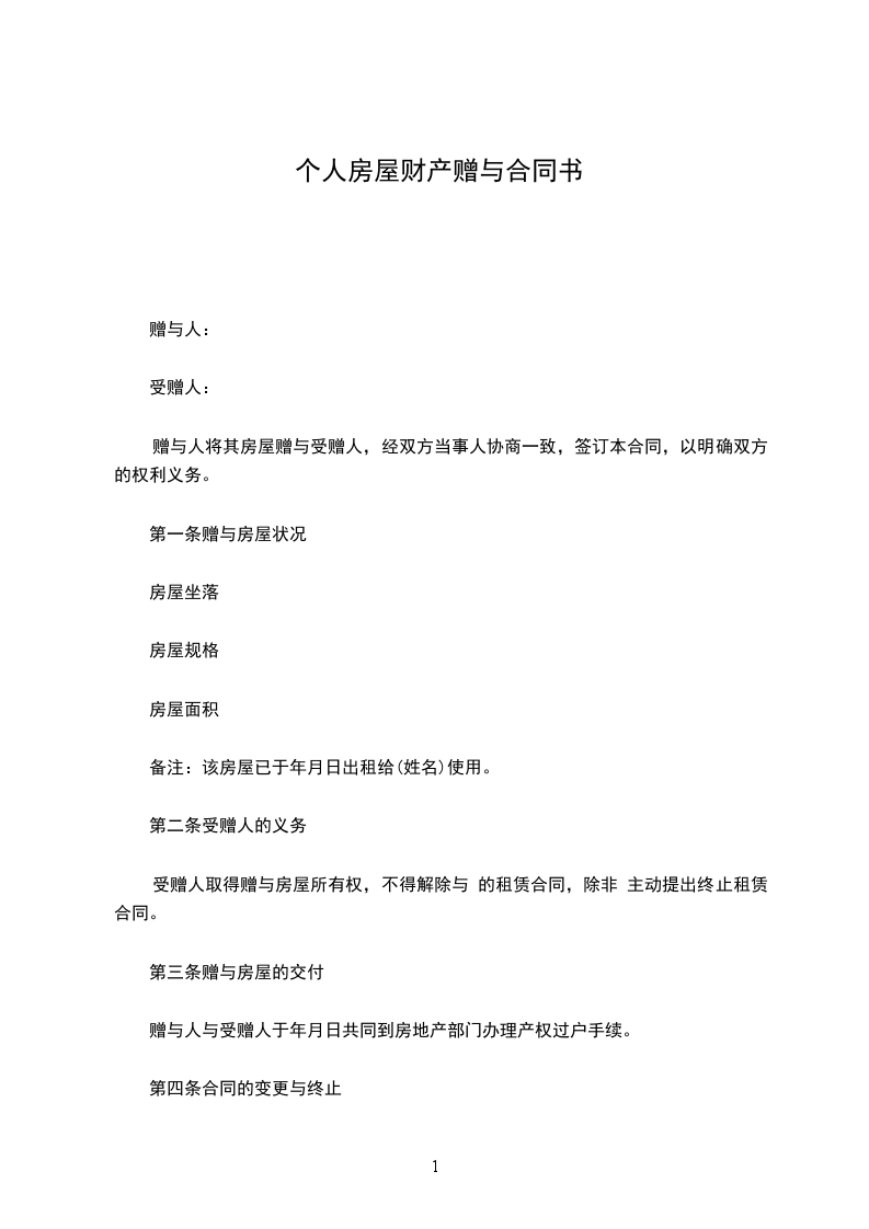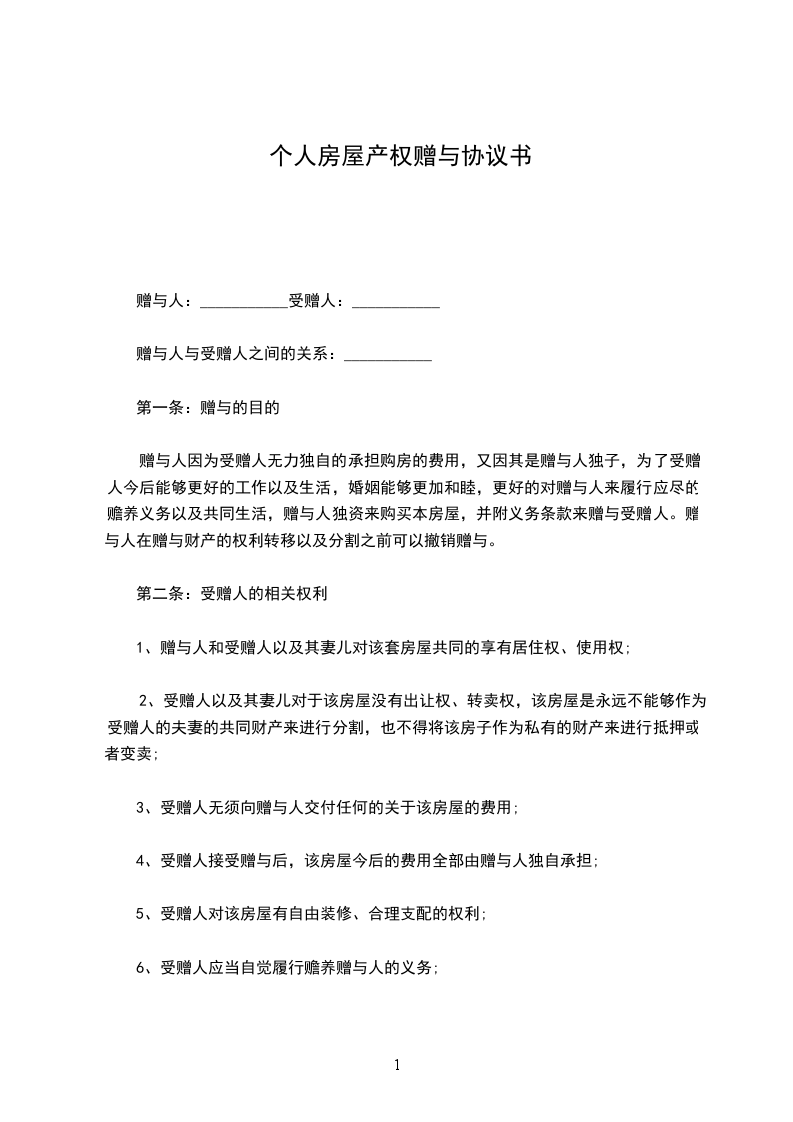第一条甲方决定将位于_______市_______区_________街_________楼_________层_________号的房屋一套,房屋所有权证号:_____________________,建筑面积_________平方米(商房、住宅)无偿赠与给乙方;乙方同意接受此赠与。甲方保证其对上述房屋拥有所有权。